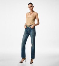 - STRAIGHT FIT PANTS - 5 POCKETS STYLE - TOM FORD SIGNATURE TACK BUTTON CLOSURE AND RIVETS - TOM FORD EMBOSSED ALCANTARA LABEL ON BACK POCKET - ANTIQUE SILVER AND COPPER HARDWARE - CRAFTED IN STONE-WASHED DENIM - MADE IN USA - 100% COTTON