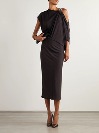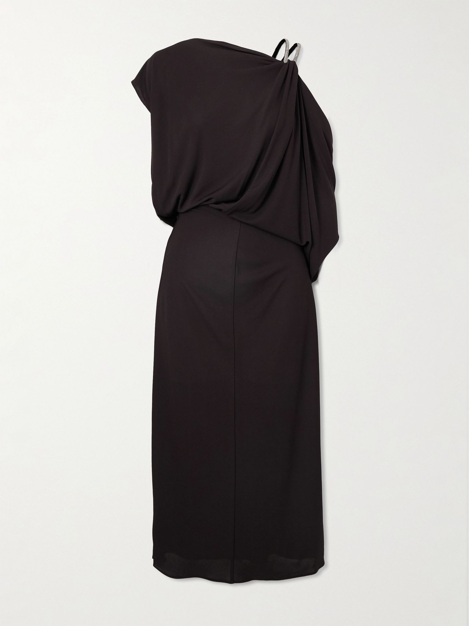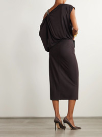 TOM FORD's dress is languidly draped over the shoulder with a crystal-embellished strap that adds to the glamour. It's cut from fluid jersey with a fitted waist and figure-skimming midi skirt. Style with diamond jewelry to add a little extra sparkle. Size & Fit - Fits true to size, take your normal size - Designed to be fitted at the hip with a loosely cut top - Lightweight, stretchy fabric - Model is 177cm/ 5'10" and is wearing an IT 40 Model measurements: - Bust: 86cm/ 34" - Waist: 65cm/ 25.5" - Hip: 90cm/ 35.5" Details & Care - Dark-brown jersey - 100% viscose - Slips on