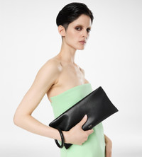 PRODUCT NO: L1925-LSP043P An ultra-soft TOM FORD elongated clutch. Finished with a leather-covered wristlet ring and inlaid metal T and an useful pull-off mirror, designed for elegant hand carry. Composition: 100% sheepskin Dimensions: 32 x 15 x 1 cm Lining: nappa leather Details: top-zip closure, pull-off mirror, one main compartment Made in Italy