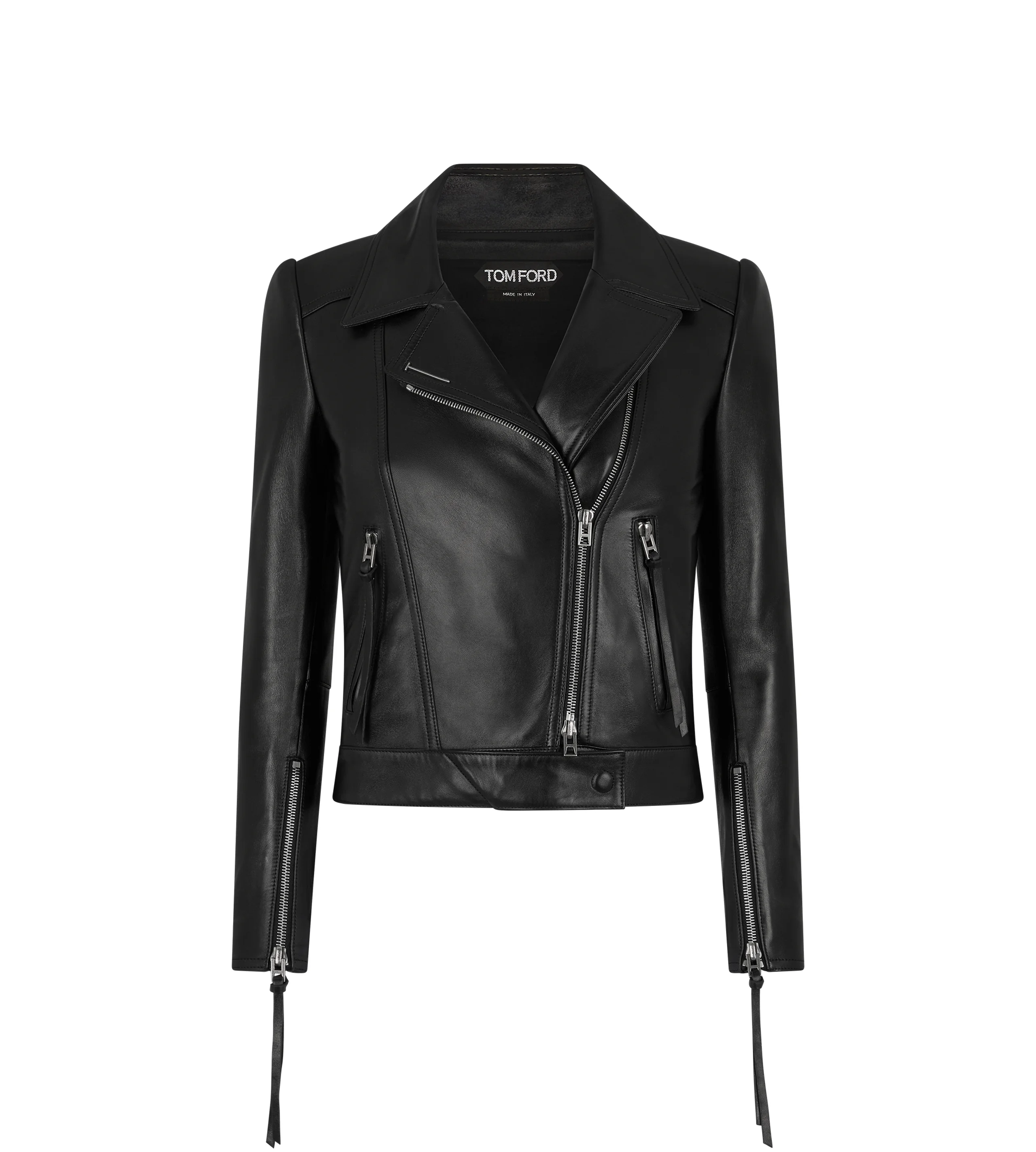 PRODUCT NO: CSL798-LEX373 The TOM FORD biker jacket is crafted in nappa leather with TOM FORD zippers featuring the new H-shape puller on the front closure, pockets and cuffs. A T-embellishment metal rivet detail on the lapel and vintage silver hardware complete the piece. Composition: 100% lamb leather Made in Italy