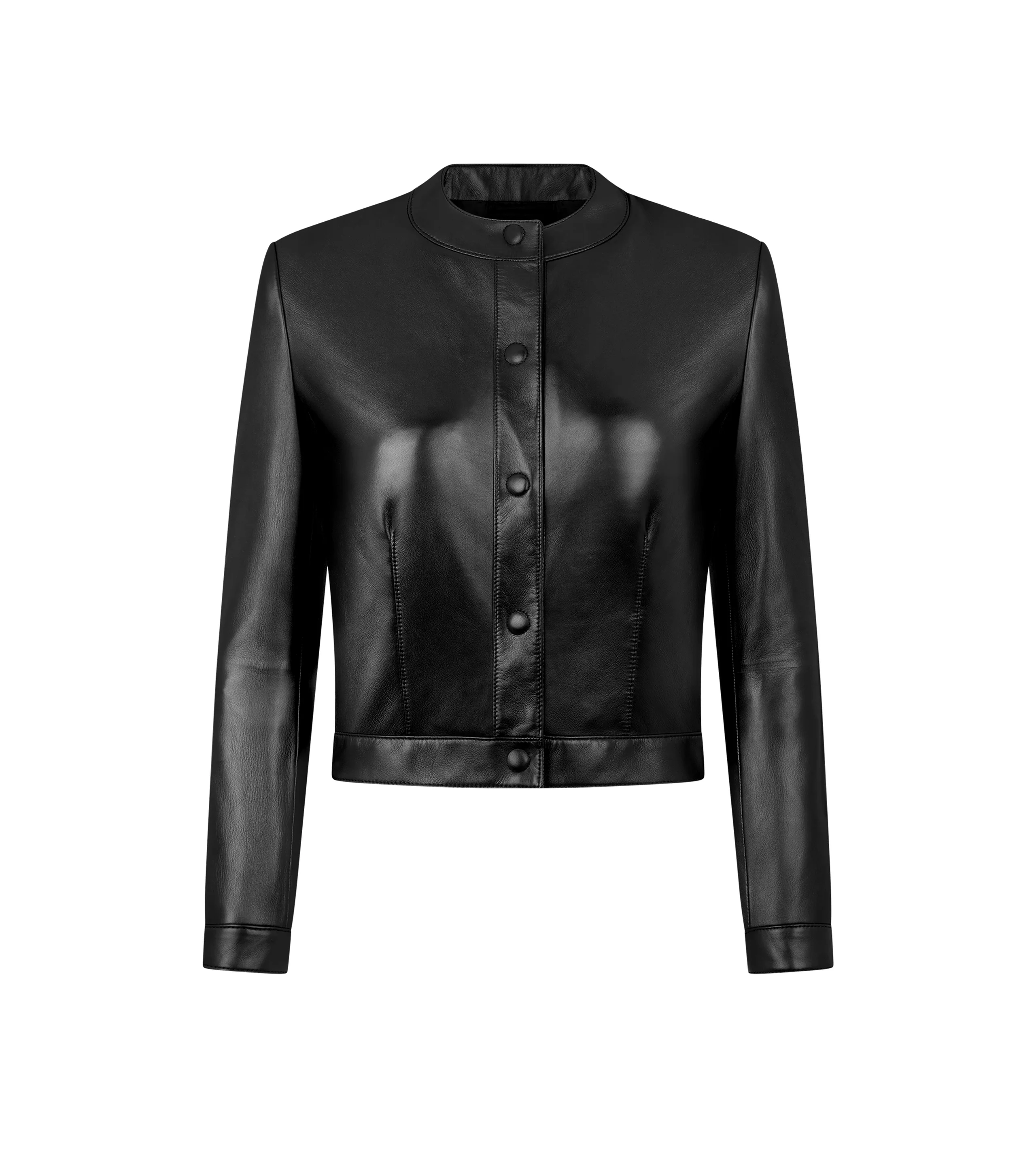 - CARDIGAN JACKET - SLIM FIT - ELEGANT AND SLIM SLEEVE CONSTRUCTION, NARROW WITH A DELICATE CURVED SHAPE - STITCHED CONCEALED PRESS SNAP BUTTONS - TWO DARTS ON THE FRONT - T TACK DETAILS ON SLEEVES - FULLY LINED - CRAFTED IN NAPPA LEATHER - 100% LAMB LEATHER - MADE IN ITALY