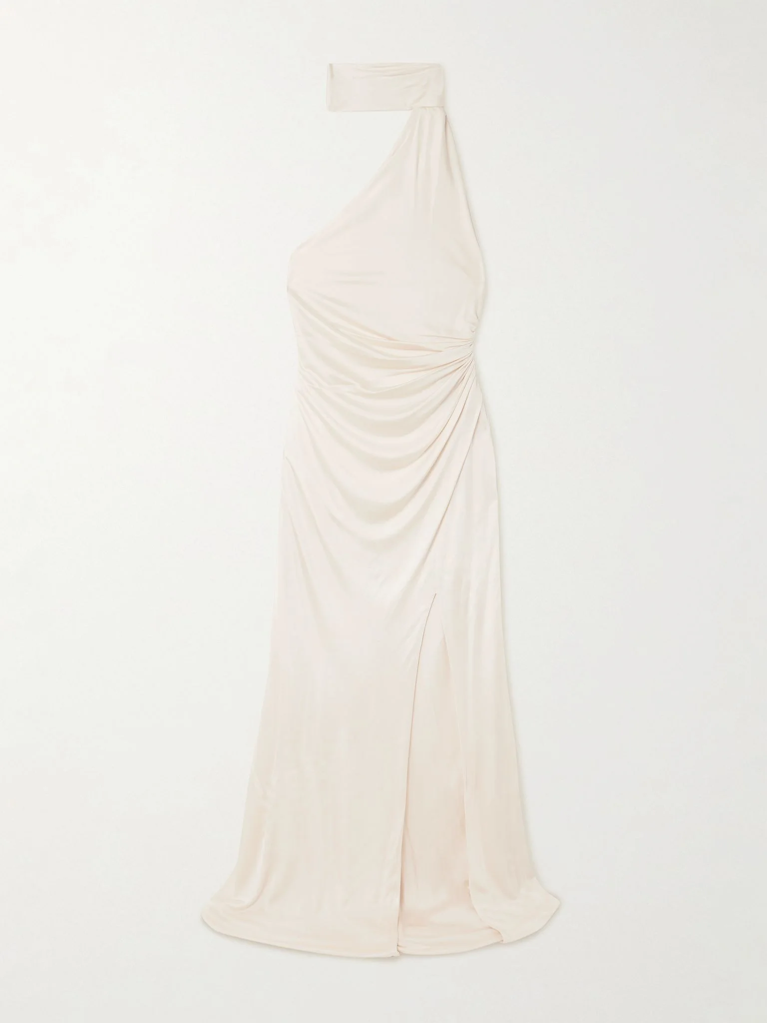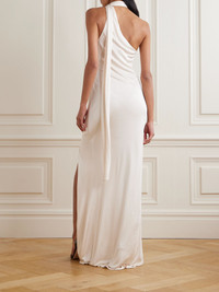 TOM FORD’s gown is made from satin-jersey that has a beautiful shine and fluid movement to it. Designed with a one-shoulder neckline, it’s gently ruched at the waist and has a generous front split to show off your choice of heels. Let the long panel flow behind you as you walk, or loop it around your neck for an effortlessly glamorous look. Size & Fit - Fits true to size, take your normal size - Designed for a close fit - High leg split - Mid-weight, fluid, non-stretchy fabric - Model is 175cm/ 5'9" and is wearing an IT 40 Model measurements: - Bust: 81cm/ 32" - Waist: 62cm/ 24.5" - Hip: 89cm/ 35" Details & Care - Off-white satin-jersey - Concealed hook and zip fastening at side - 100% viscose; lining: 100% silk - Dry clean