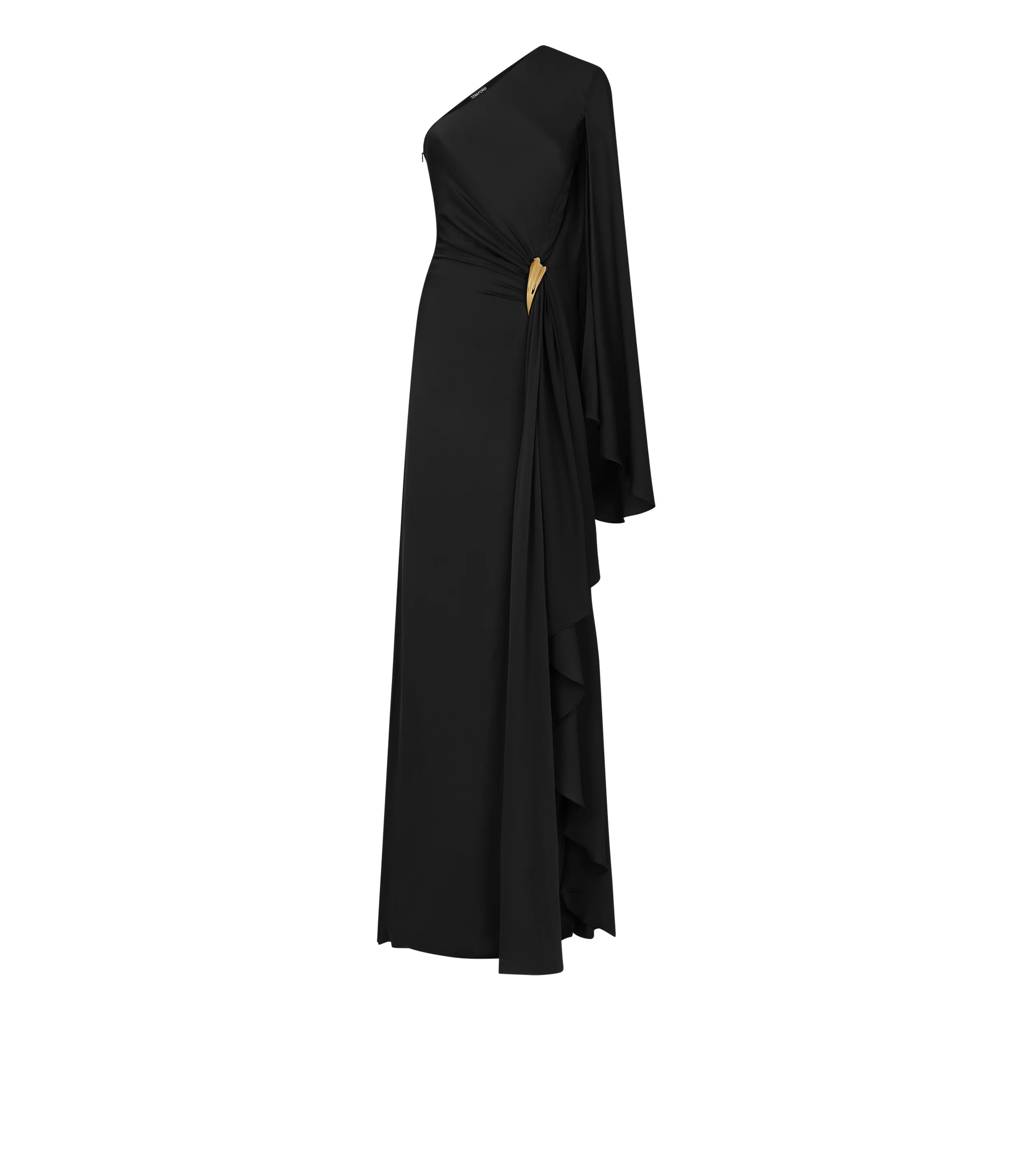 ONE SHOULDER EVENING DRESS WITH CAPE AND LIZA HARDWARE DETAIL