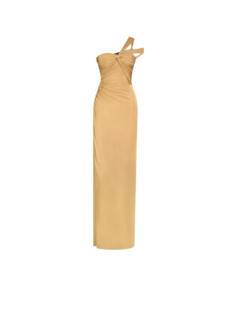 - ONE SHOULDER EVENING DRESS - TWO STRAPS THAT CROSS AT THE CENTER OF THE CHEST - FLOOR LENGTH - KNOT AT THE CENTRE OF THE NECKLINE - INTERNAL MINI DRESS IN MESH , - SIDE GATHERING , - SIDE SLIT - INVISIBLE ZIP - CRAFTED IN FLUID KNITTED VISCOSE STRETCH JERSEY - 97% VISCOSE 3% ELASTANE , - MADE IN ITALY