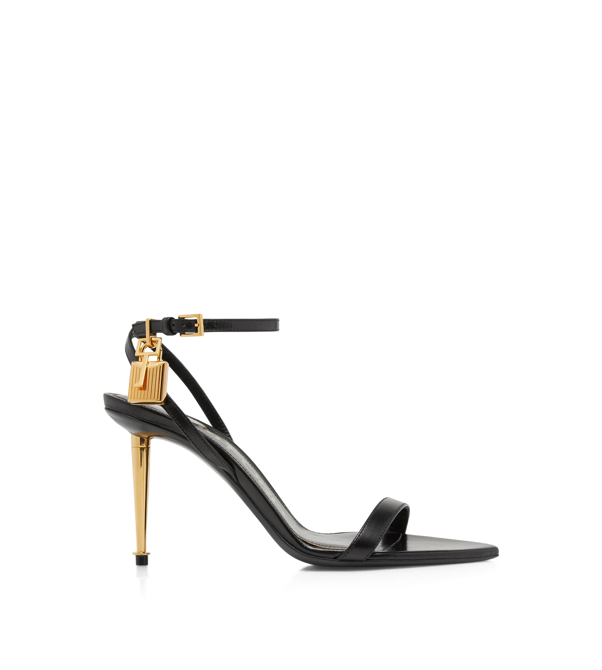 - POINTY TOE SHAPE - SIGNATURE PADLOCK METAL HARDWARE - 85 MM ICONIC METAL SPIKE HEEL - ADJUSTABLE BUCKLE ANKLE STRAP - BUCKLES WITH ENGRAVED TOM FORD LOGO - LINING: BLACK LEATHER - INSOLE: BLACK LEATHER WITH GOLD OR SILVER EMBOSSED TOM FORD - SOLE: LEATHER - 100% GOATSKIN