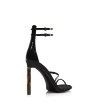 - ROUND TOE SHAPE - 105 MM TORTOISE SHELL-EFFECT STILETTO HEEL WITH SIGNATURE T IN PALE GOLD GALVANIC - ADJUSTABLE LOGO ENGRAVED BUCKLE ANKLE STRAP - LINING: NUDE LEATHER - NSOLE: BLACK LEATHER WITH SCREEN PRINTED LOGO - SOLE: BLACK LEATHER WITH RUBBER TAP DETAIL - 100% CALFSKIN - MADE IN ITALY