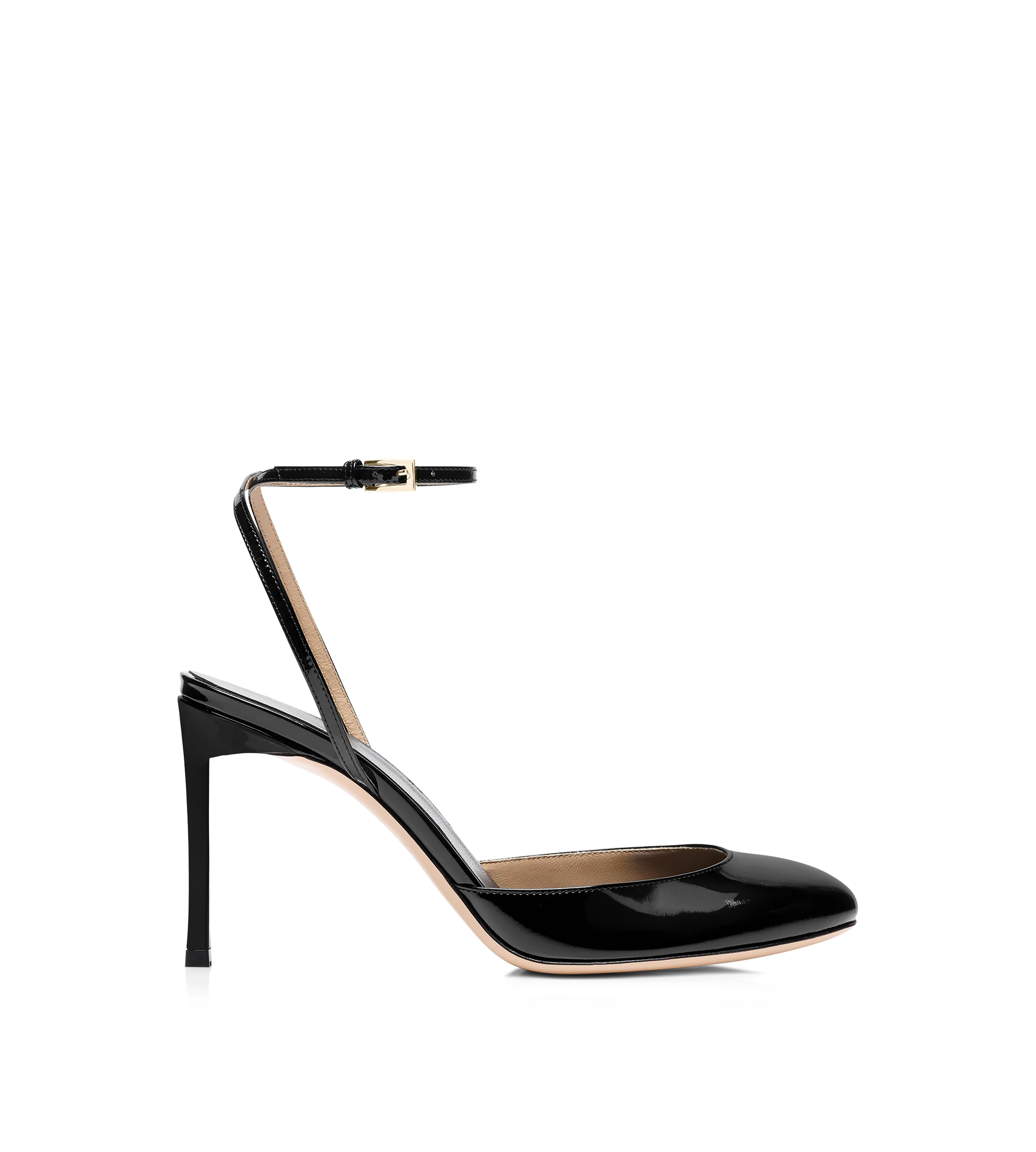 PRODUCT NO: W3893-LCL072P The TOM FORD Selen pump is crafted in patent leather with a round toe, an 85mm stiletto heel and an adjustable ankle strap finished with a logo-engraved buckle. A nude leather lining and sole complete a shoe of refined elegance. Composition: 100% calfskin Made in Italy For an ideal fit, we advise choosing TOM FORD Women's shoes in half a size larger than your standard size, as they tend to run slightly small.