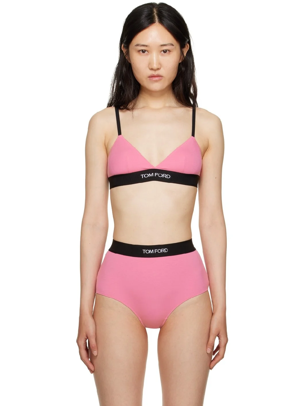 Stretch modal jersey bra. · V-neck · Jacquard logo at elasticized hem · Adjustable spaghetti straps · Hook-eye fastening at back · Partial stretch jersey lining Supplier color: Rosebloom Body: 97% modal, 3% elastane. Trim: 82% polyester, 9% elastane, 9% polyamide. Made in Italy 232076F073002