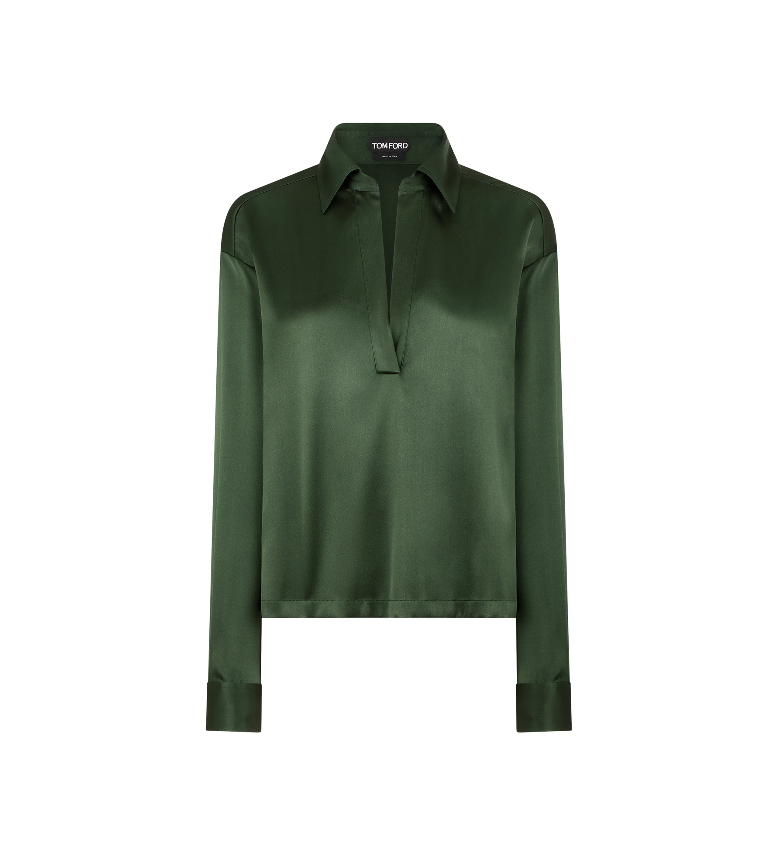 - OPEN POLO WITH TONAL TF EMBROIDERED LOGO - LONG SLEEVE - REGULAR FIT - SELF COVERED BUTTONS AT THE CUFFS - CRAFTED IN STRETCH SILK SATIN - 94% SILK 6% ELASTANE - MADE IN ITALY