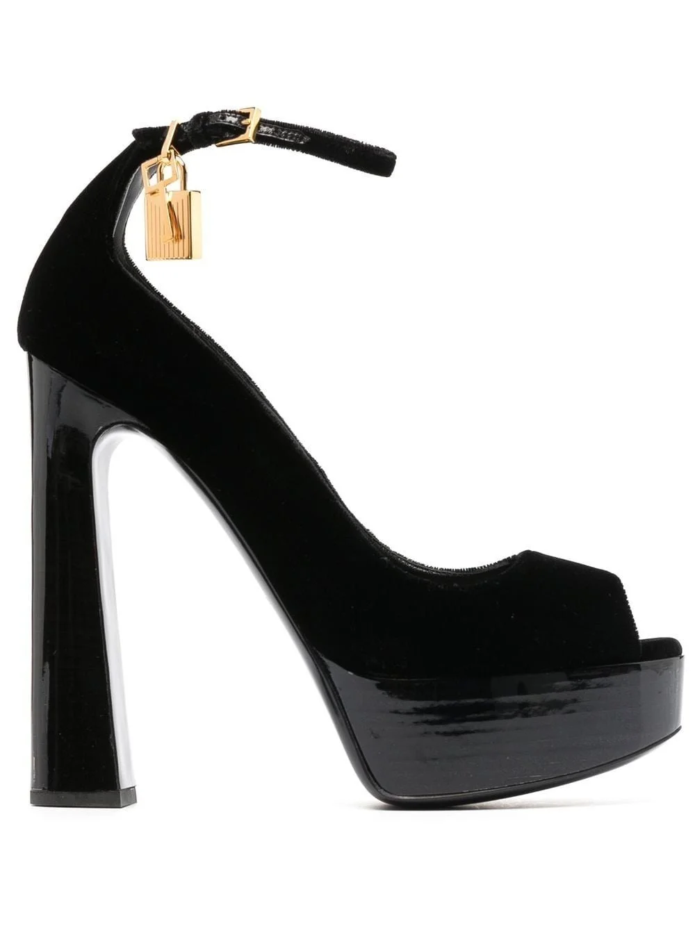 platform 145mm sandals core black velvet finish branded leather insole peep toe buckle-fastening ankle strap platform sole 145mm high heel Made in Italy Composition Lining: Calf Leather 100%, Viscose 100% Sole: Calf Leather 100% Outer: Viscose 100% SIZE & FIT Measurement HEEL 6.1 in(15.5 cm) Sole height 1.77 in(4.5 cm)