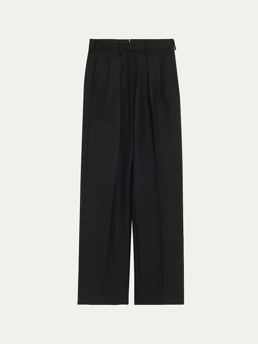 These low-slung wool-blend trousers by TOM FORD feature leg-elongating front and back creases and knee darts High rise Side seam pockets Buttoned back besom pockets Full length Wide legs Hidden hook/zip fly; belt loops Wool/linen/silk Made in Italy Online Inquiries: BGS21_BAZN3| Store Inquiries: #5358004