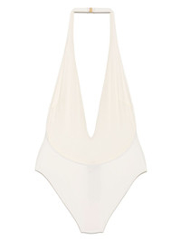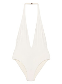 plunging haler one-piece swimsuit Highlights - White - Buckle fastening - V-neck - Sleeveless - Halterneck - Be mindful to try on swimwear over your own garments. Made in Italy Composition Polyimide 62%, Elastane 38%
