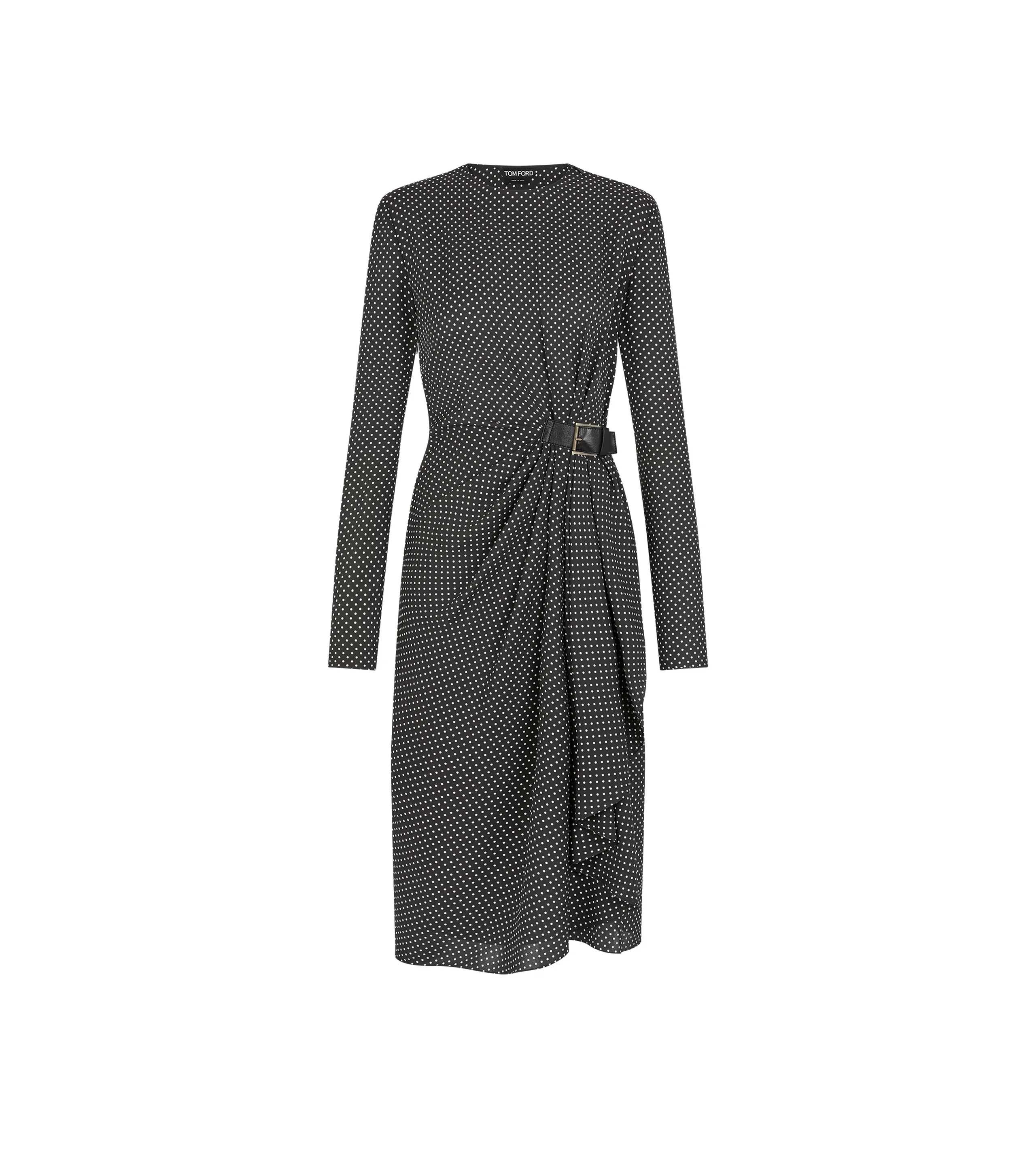- LONG SLEEVE DRESS - DRAPED FRONT FINISHED WITH EDGE-DYED LEATHER TAB AND TF SIGNATURE METAL BUCKLE - DOUBLE IN SELF FABRIC - CRAFTED IN PRINTED IRREGULAR SMALL POLKA DOT SILK SABLE - 100% SILK - MADE IN ITALY