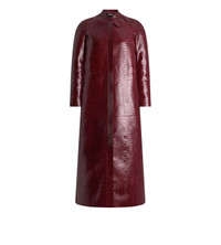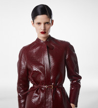 PRODUCT NO: CPL726-LET033 This coat embodies TOM FORD's iconic approach to leather. Internally bonded with washed silk duchesse, it achieves a total look leather statement with a refined texture. The masculine relaxed silhouette is defined by sharp shoulders, a structured neckline, and raglan sleeves, balanced by a collar with stitched, concealed press snap buttons under tab fastenings. The centre front placket conceals a zip closure, while metal zippers with the new “H” shaped pullers, enriched with hand tacked leather ties, introduce elevated hardware detailing. Front slashed cut in pockets with stitched framing, self leather seam bindings, and raw cut, hand painted edges are examples of craftsmanship. Finished with invisible joint cuts, a single vent, and vintage silver finish hardware, it is a modern interpretation of biker heritage. Unveiled on the runway, this look is part of Haider Ackermann’s first Winter 2025 Fashion Show. Composition: 100% calf leather with lining made of 100% silk Made in Italy