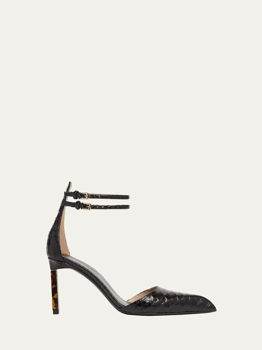 TOM FORD sandals in bicolor pythonstamped calf leather with a contrasting tortoise heel 3.25 in / 85 mm stiletto heel Pointed toe Double buckle ankle straps Goat leather lining Leather outsole Made in Italy