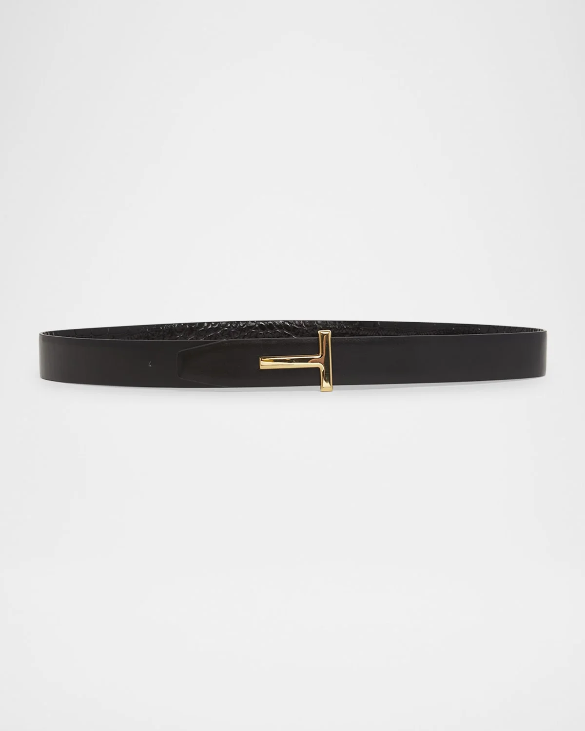 - TOM FORD belt in pebble grain leather and brass - Reverses to smooth leather - Signature T buckle - Cut to size - Tapered end - Made in Italy