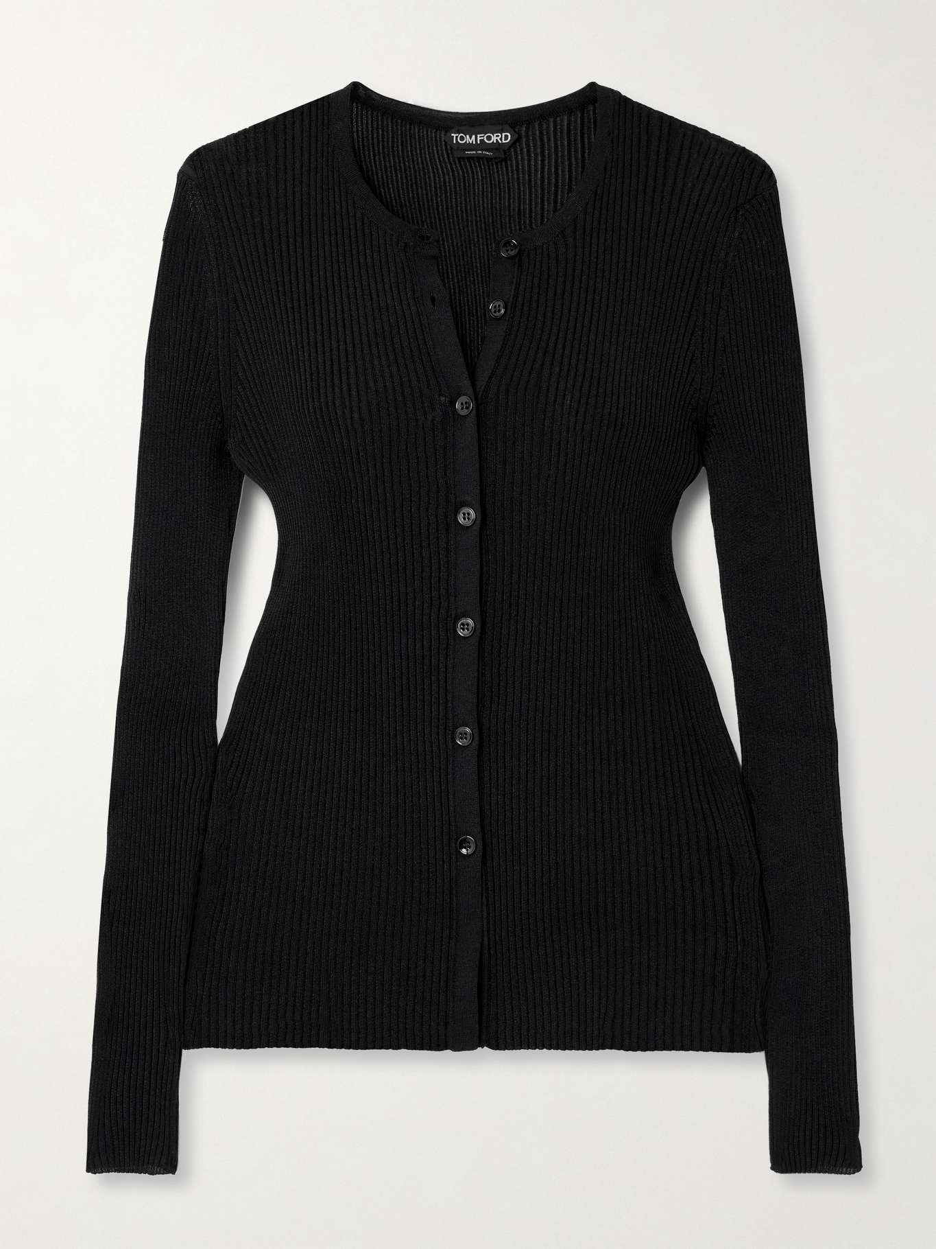 EDITORS'NOTES TOM FORD's cardigan is rib-knitted from soft fibers that almost appear glossy in a certain light. It's designed for a slim fit and has a classic crew neckline. Slip yours on over a tee or tank. SIZE & FIT - Fits true to size, take your normal size - Designed for a slim fit - Fine knit - Model is 177cm/ 5'10" and is wearing a size Small DETAILS & CARE - Black ribbed-knit - Button fastenings through front - 87% viscose, 13% polyamide - Dry clean - Mother-of-pearl: Indonesia