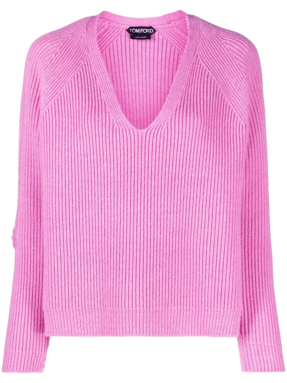 ribbed V-neck jumper This pink jumper from TOM FORD is spun from a soft blend of wool and silk to a relaxed silhouette. It's complete with a V-neck and a ribbed design. Highlights - Bubblegum pink - Wool-silk blend - Chunky ribbed knit - V-neck - Long sleeves - Straight hem Made in Italy Composition Wool 67%, Silk 23%, Polyester 10% SIZE & FIT Model measurements Height 5 ft 11 in(1.8 m) Bust/Chest 32.67 in(83 cm) Hips 36.22 in(92 cm) Waist 24.4 in(62 cm) FittingInformation Designed for a relaxed fit, this piece allows for comfort and movement when worn Made with a midweight knit, this piece offers some stretch This piece fits true to size – take your usual size Washing instructions Hand Wash