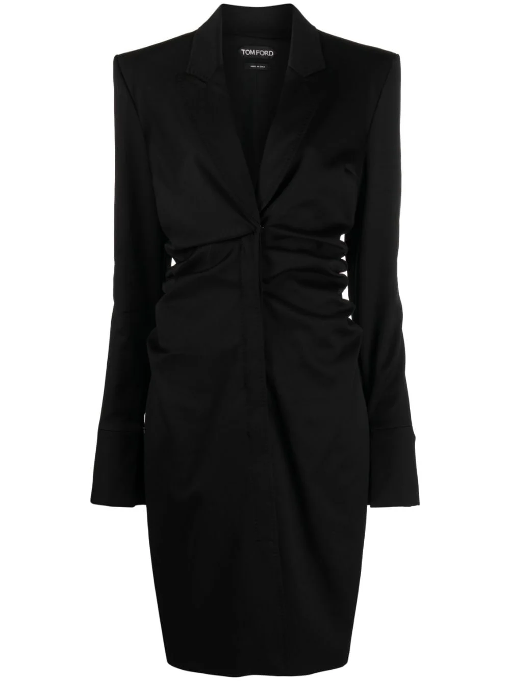 ruch tailored midi dress Inspired by timeless tailoring, this black dress from Tom Ford is made in Italy from a blend of cotton and cut to a fitted silhouette. Ruched at the bodice for added texture, it boasts peaked lapels and split cuffs. Made in Italy Composition Outer: Cotton 94%, Spandex/Elastane 6% Lining: Silk 92%, Spandex/Elastane 8% SIZE & FIT Model measurements Height 5 ft 10 in(1.77 m) Bust/Chest 32.28 in(82 cm) Hips 35.03 in(89 cm) Waist 25.19 in(64 cm) FittingInformation Designed for a slim fit that sits just away from the body offering a close yet comfortable fit The internal shoulder pads offer a structured shape Made from a midweight stretch fabric, this piece offers elasticity and flexibility when worn This piece fits true to size – take your usual size Washing instructions Dry Clean Only