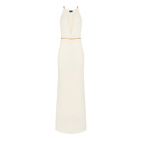 - LONG SLEEVELESS EVENING DRESS - DEEP KEYHOLE DROP , - DEEP SIDE CUTS WITH CHAIN DETAILS - GOLD METAL SHOULDER STRAPS AND CHAIN BELT - HIDDEN INTERNAL BELT LOOPS ON THE BACK - FULLY LINED IN VISCOSE - CRAFTED IN SABLE JERSEY - 82% VISCOSE 18% NYLON