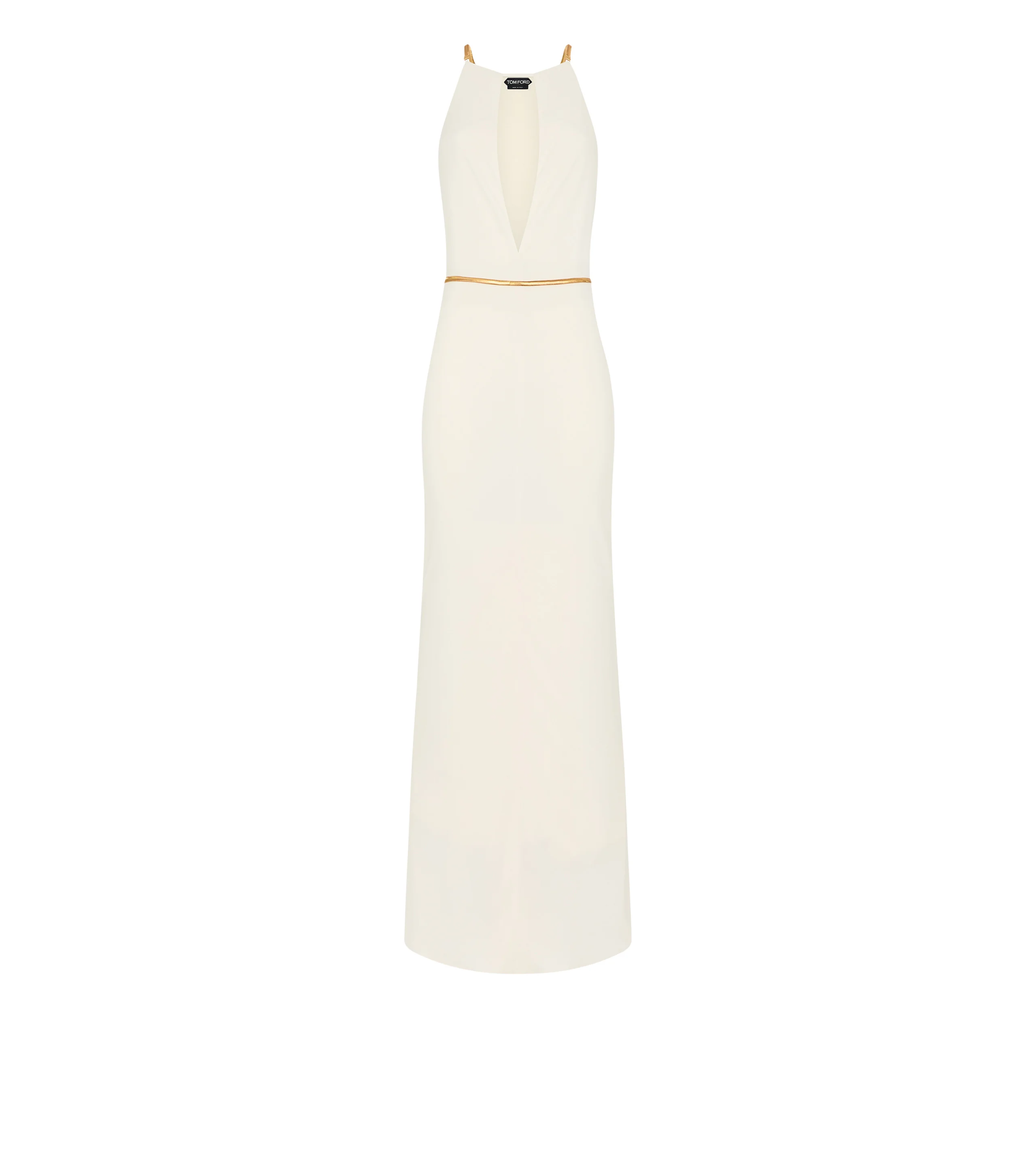- LONG SLEEVELESS EVENING DRESS - DEEP KEYHOLE DROP - DEEP SIDE CUTS WITH CHAIN DETAILS - GOLD METAL SHOULDER STRAPS AND CHAIN BELT - HIDDEN INTERNAL BELT LOOPS ON THE BACK - FULLY LINED IN VISCOSE - CRAFTED IN SABLE JERSEY - 82% VISCOSE 18% NYLON
