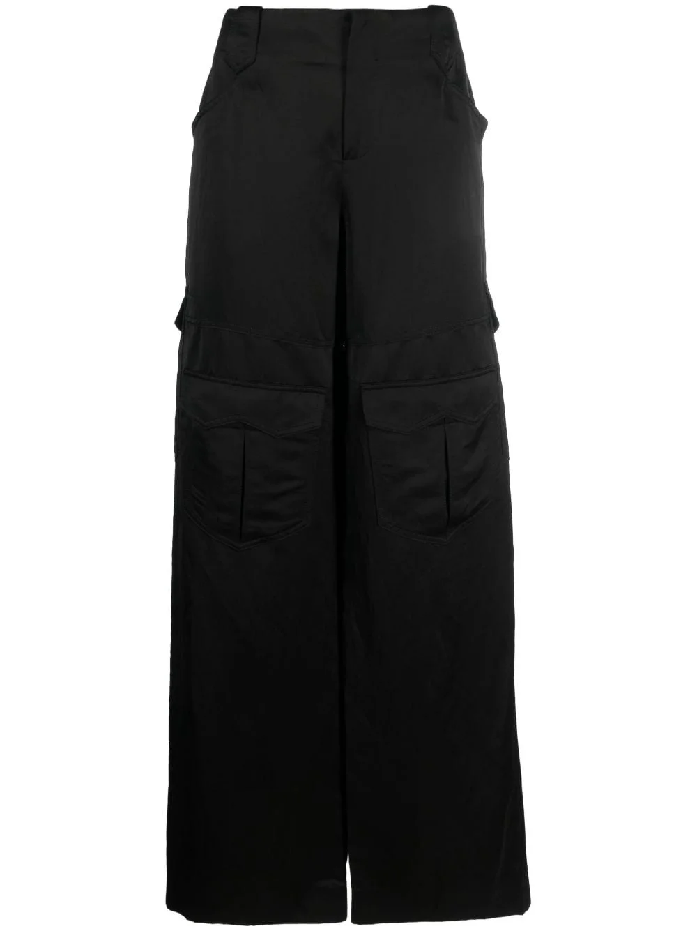 satin cargo trousers A refined twist on classic cargo styles, these black satin trousers from TOM FORD boast a wide-leg silhouette complete with multiple flap pockets. Highlights - Black - Satin weave - High waist - Belt loops - Button fly fastening - Multiple cargo pockets - Wide leg Made in Italy Composition Viscose 54%, Polyester 46% SIZE & FIT Model measurements Height 5 ft 10 in(1.79 m) Bust/Chest 31.49 in(80 cm) Hips 35.03 in(89 cm) Waist 23.62 in(60 cm) FittingInformation Designed with a wide-leg cut, these trousers allow for a close fit at the waist and offer a loose and roomy fit over the leg Made from a midweight non-stretch fabric This piece fits true to size – take your usual size Washing instructions Dry Clean Only