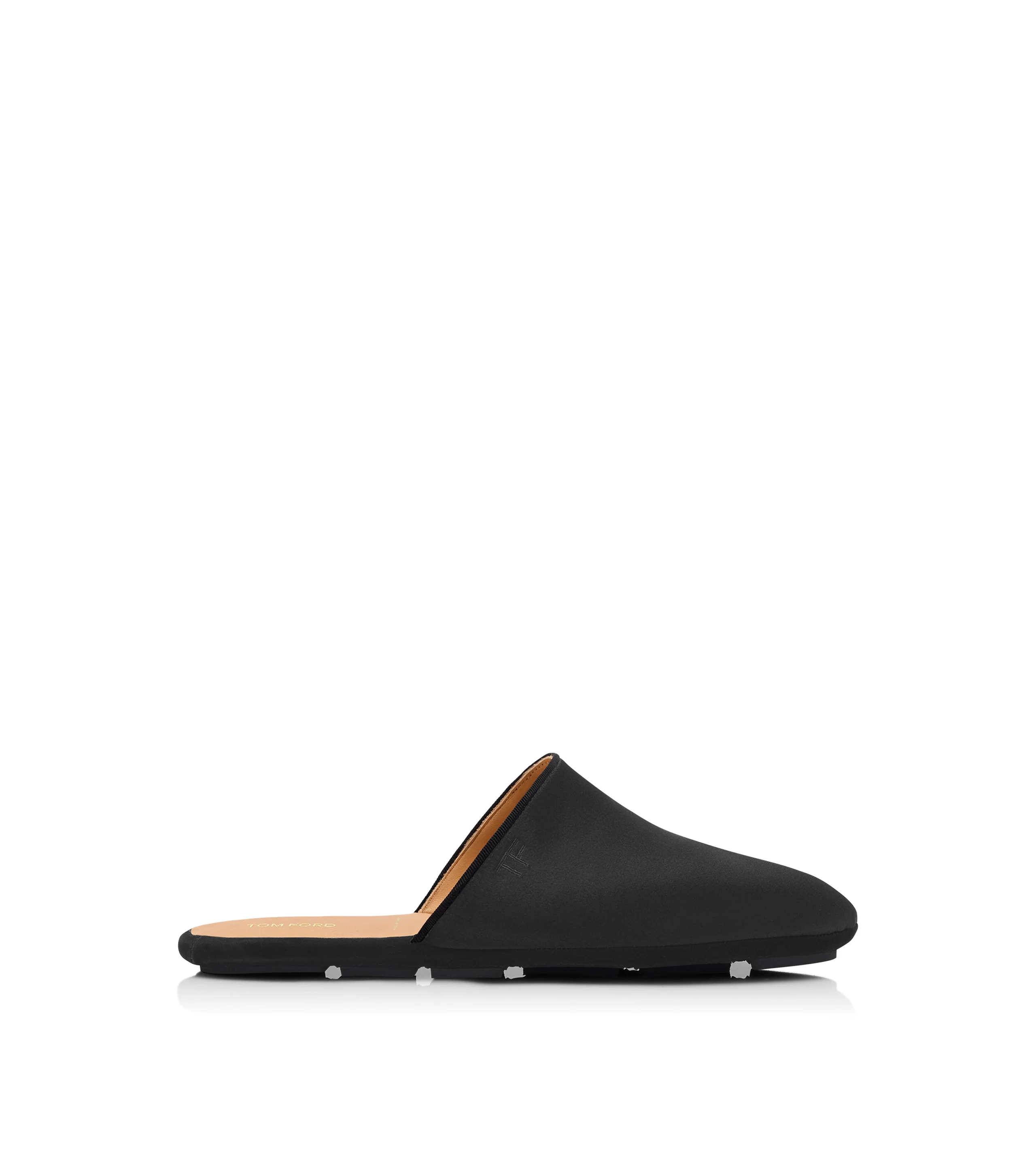 PRODUCT NO: W3840-TSA001N An essential TOM FORD slipper in fluid satin, shaped with a rounded toe and finished with an embroidered TF detail. Designed for ease and versatility, it includes a zipped pouch. Composition: 68% viscose 32% silk Lining: nude leather , sole: black rubber with embossed logo Made in Italy