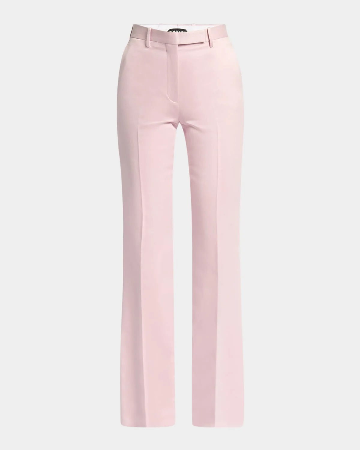 TOM FORD pants tailored in a silkblend satin Mid rise sits high on hip Side slip pockets Back buttonwelt pockets Straight legs Full length Hooktab/zip fly; belt loops Silk/nylon/polyamide Made in Italy