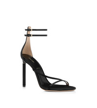 PRODUCT NO: W3795-TSA001P A refined TOM FORD ankle-strap sandal in satin, featuring a round toe shape, double adjustable straps, and a high stiletto heel finished with signature T hardware. Composition: 68% viscose, 32% silk Lining: nude leather Sole: nude leather Heel: 105 mm stiletto heel Galvanic: pale gold Made in Italy