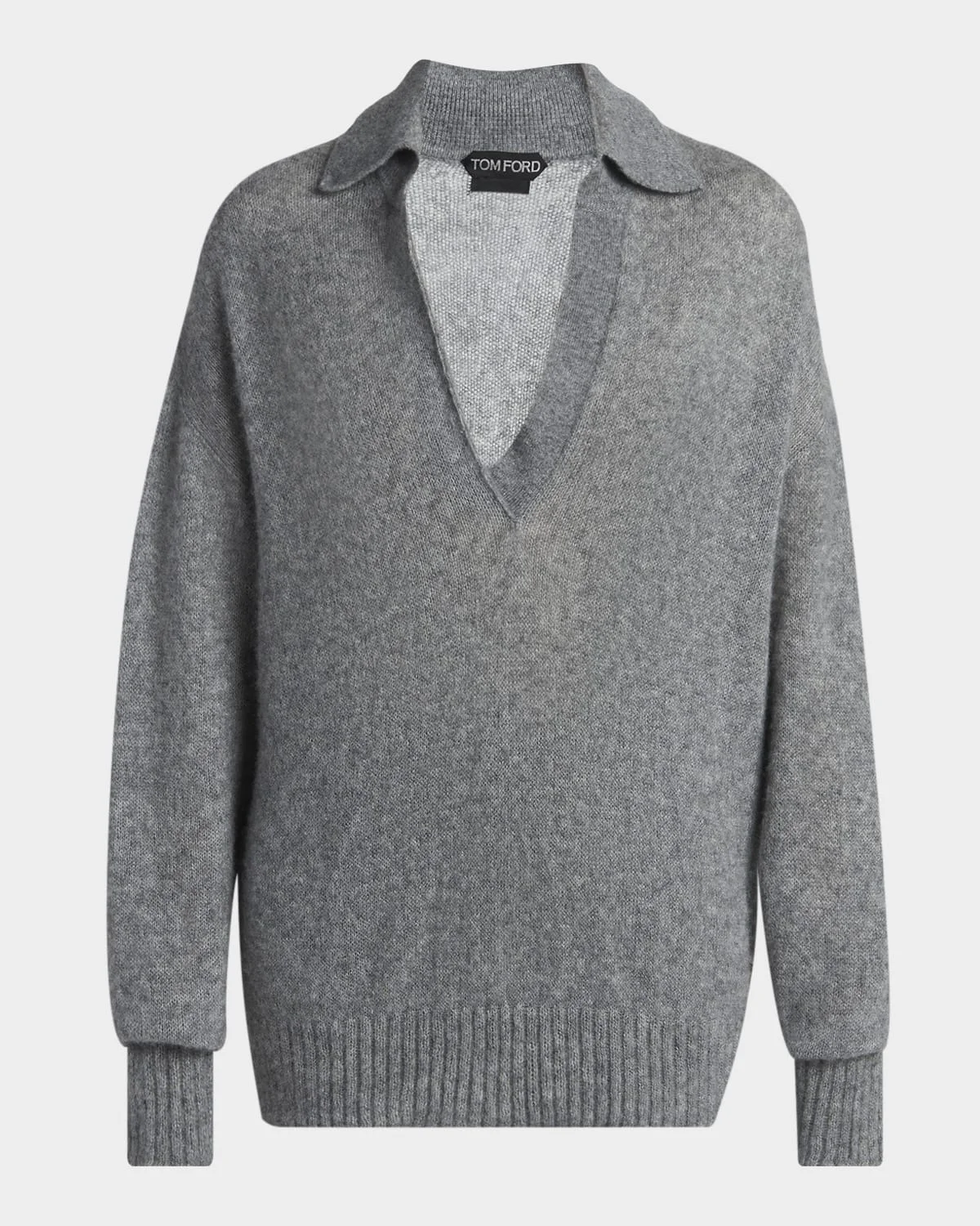 TOM FORD polo sweater is crafted from seamless ultrasoft woolblend Spread collar; split V front Long sleeves Loose fit Ribbed cuffs and hem Pullover style Wool/silk/nylon/polyamide Made in Italy