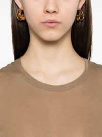 semi-sheer T-shirt Highlights - Camel brown - Crew neck - Short sleeves - Short side slits Made in Italy Composition Bamboo 100% SIZE & FIT Model measurements Height 5 ft 10 in(1.78 m) Bust/Chest 33.85 in(86 cm) Hips 36.61 in(93 cm) Waist 26.77 in(68 cm) FittingInformation Designed for a relaxed fit, this piece allows for comfort and movement when worn Made with a lightweight knit, this piece offers some stretch