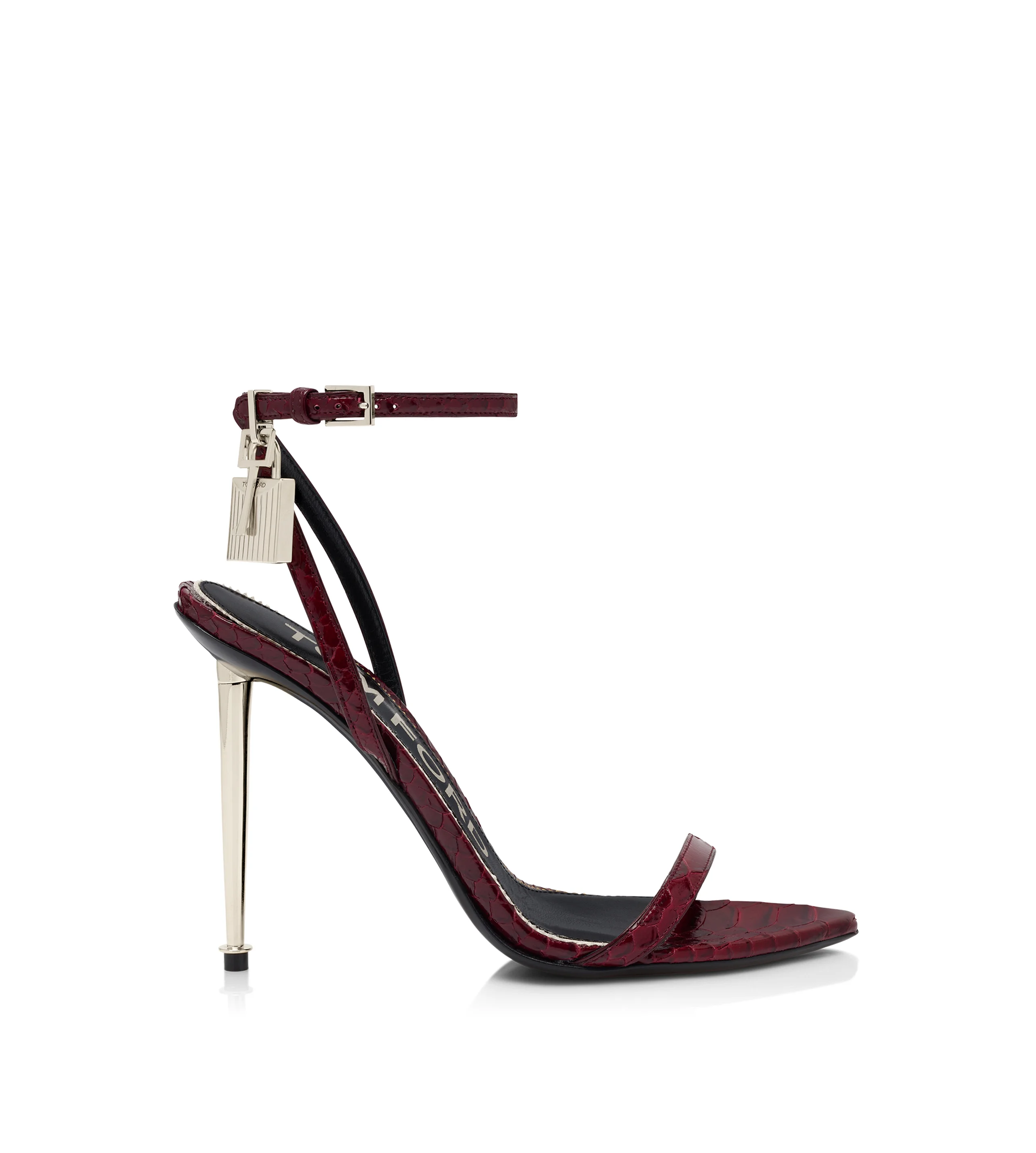 PRODUCT NO: 5955287493 An expressive TOM FORD naked sandal crafted in semi-shiny printed python, an exotic texture that brings uniqueness and confidence, shaped with a pointed toe and finished with signature padlock hardware and a metal spike heel. Composition: 100% calfskin Lining: black leather , sole: leather Heel: 105 mm metal spike heel Galvanic: pale gold Made in Italy