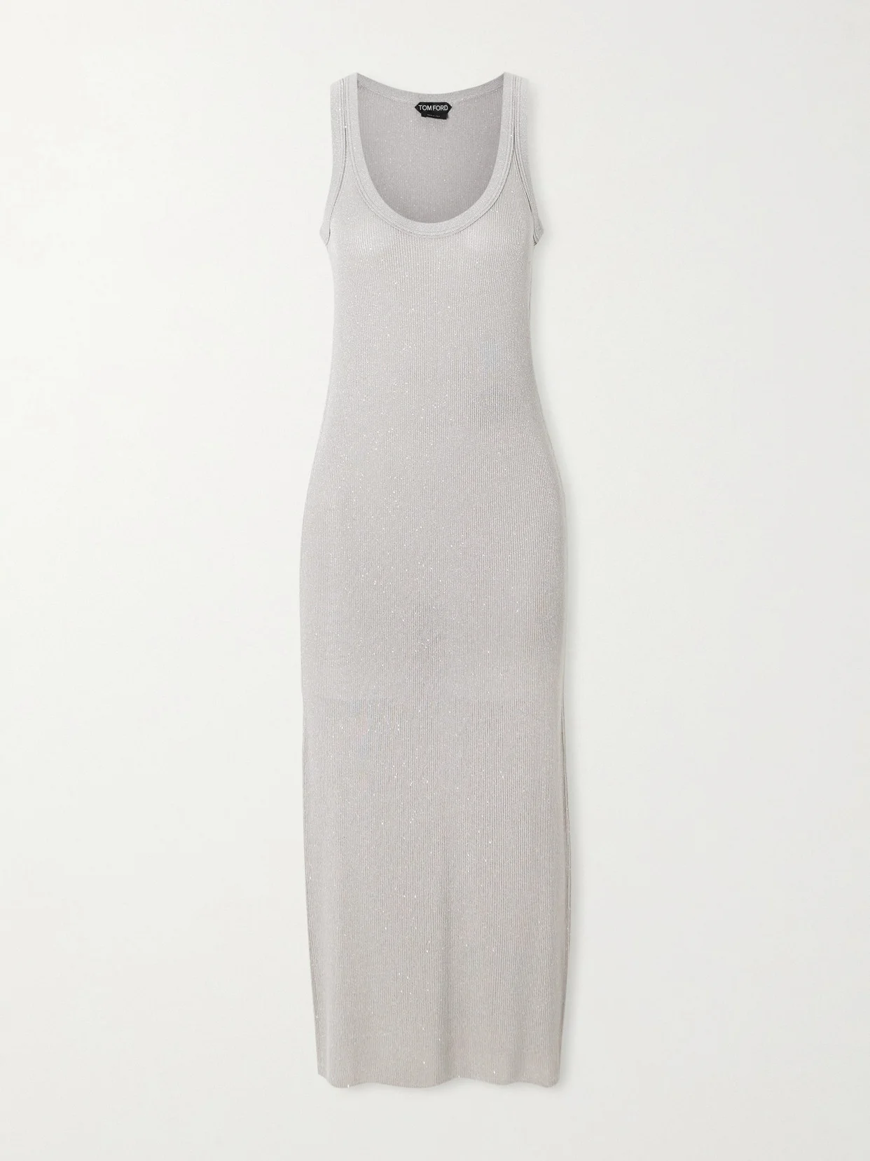 TOM FORD's dress stays true to the label's understated glamour. Made from metallic ribbed-knit, it's flecked with sequins for added sparkle and has a figure-skimming fit. Complement the deep scooped neckline with a chain.