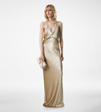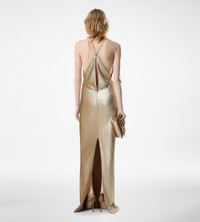 - V-NECK EVENING DRESS WITH CUT OUT - DELICATELY EMBROIDERED LINES OF OVERLAPPING MACHINE EMBROIDERED SEQUINS - SET IN A SATIN COATED GOLD COLOUR - FLOOR LENGTH - CRAFTED IN OVERLAPPING SEQUINS EMBROIDERY ON TULLE - EMBROIDERY: 100% POLYESTER ON BASE: 100% POLYAMIDE