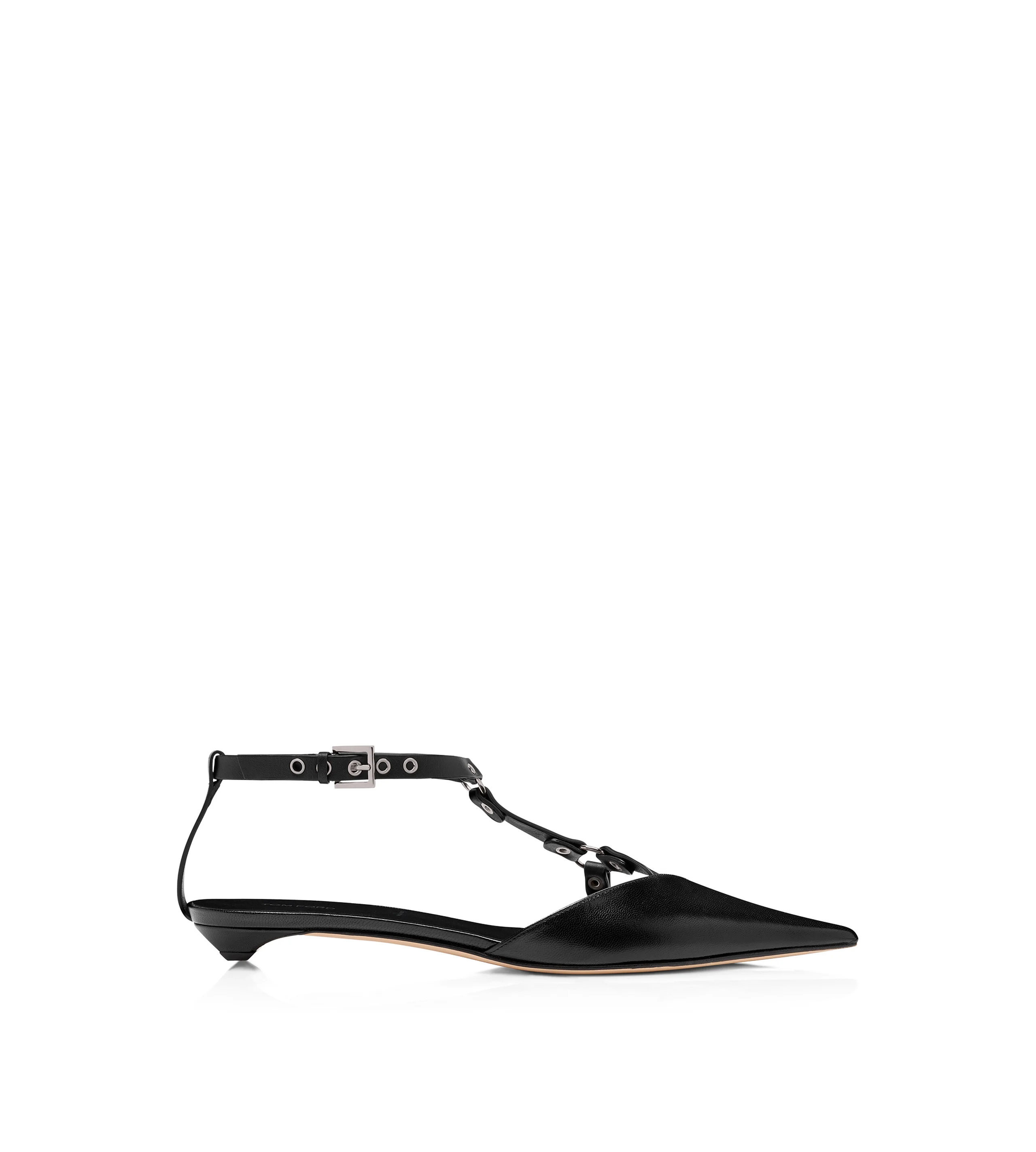 PRODUCT NO: W3886-LKD006S The TOM FORD Bound ballerina is crafted in shiny kid leather with a harness-inspired asymmetric design, silver-tone metal hardware and a pointy toe on a 15mm block heel covered in leather. An adjustable ankle strap with a logo-engraved buckle completes a flat that is an everyday essential. Composition: shiny leather 100% goatskin, straps in smooth leather 100% calfskin Made in Italy For an ideal fit, we advise choosing TOM FORD Women's shoes in half a size larger than your standard size, as they tend to run slightly small.