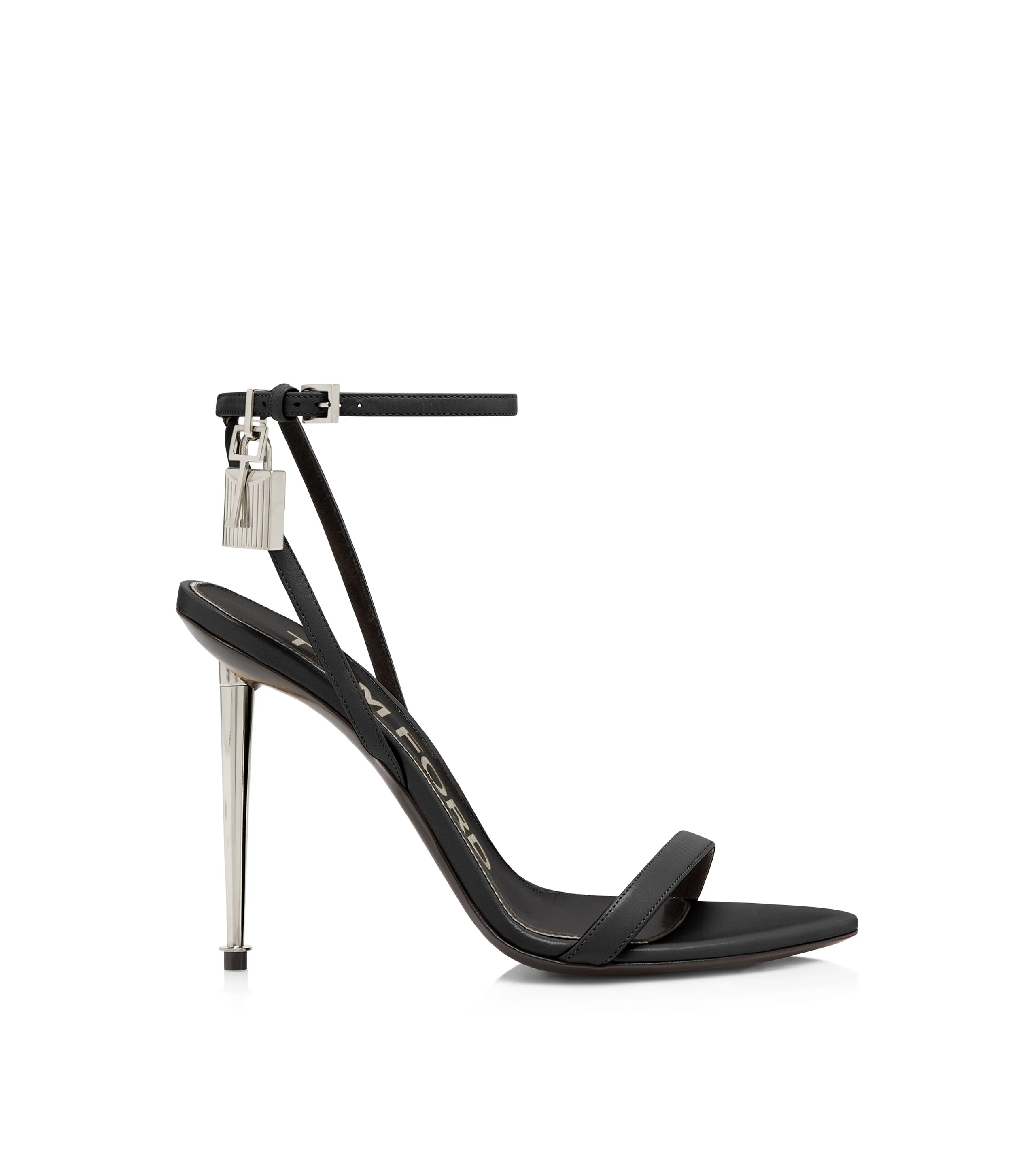 - POINTY TOE SHAPE - SIGNATURE PADLOCK METAL HARDWARE - 105 MM ICONIC METAL SPIKE HEEL - ADJUSTABLE BUCKLE ANKLE STRAP - BUCKLES WITH ENGRAVED TOM FORD LOGO - LINING: BLACK LEATHER - INSOLE: BLACK LEATHER WITH GOLD OR SILVER EMBOSSED TOM FORD - SOLE: LEATHER - 100% GOATSKIN - MADE IN ITALY