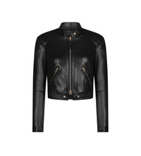 - CROPPED RACER JACKET - BIKER COLLAR WITH PRESS STUD FASTENING - WADDED DETAILS FOR SHOULDERS, ELBOW & AROUND ZIPPERS - DOUBLE ENDING SIGNATURE ZIP CLOSURE - LEATHER ZIP PULLER WITH EMBOSSED TF LOGO - FRONT SLANTED ZIPPER POCKETS WITH STITCHED FRAMING - ZIPPED CUFFS - VINTAGE SILVER FINISH HARDWARE - FULLY LINED IN VISCOSE - CRAFTED IN SHINY PLONGE LAMBER LEATHER - 100% LAMB LEATHER