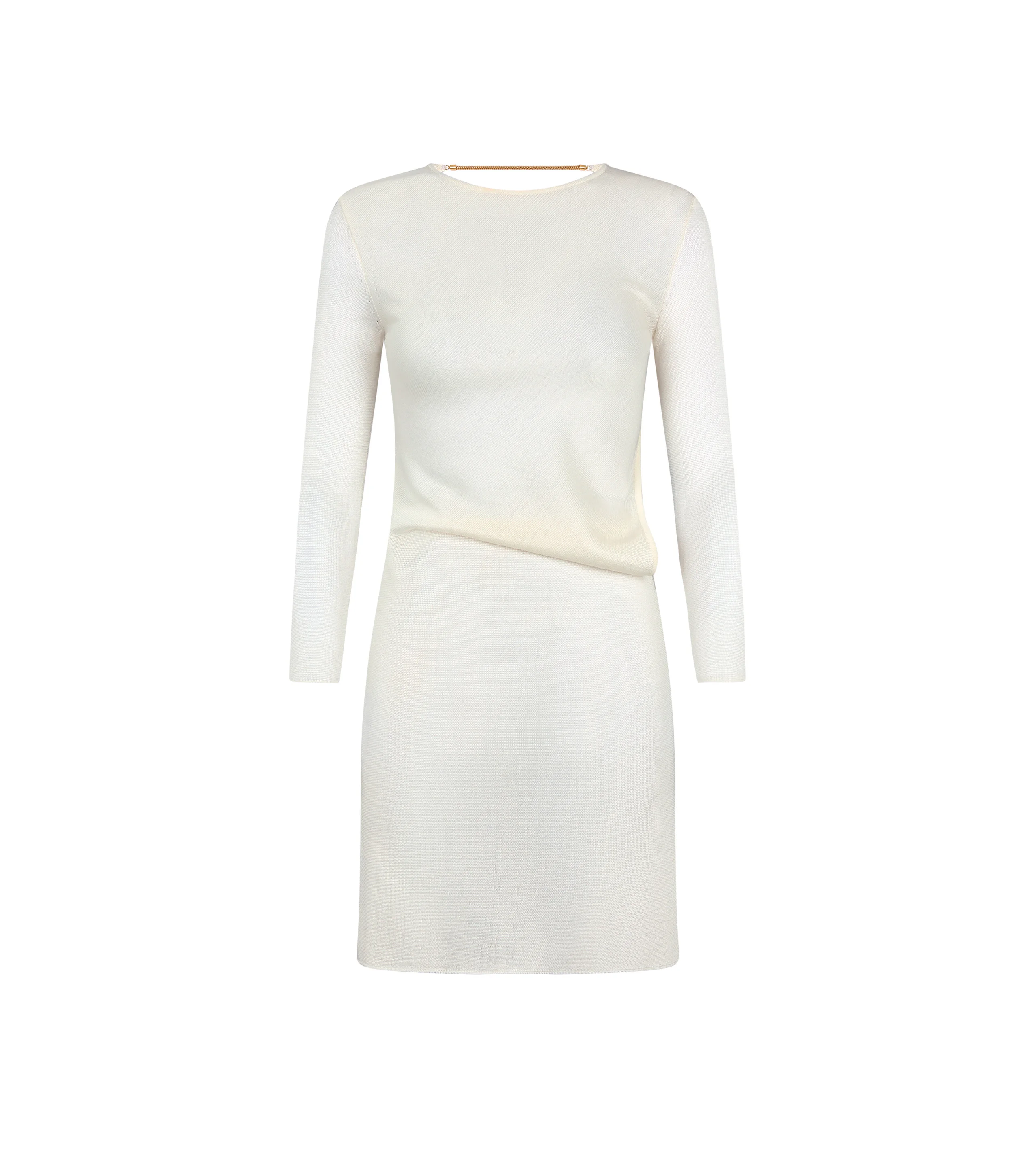 - LONG SLEEVES ASYMMETRIC MINI DRESS - BACKLESS WITH CHAIN CLOSURE DETAIL - REMOVABLE CHAIN CLOSURE - AMBER VINTAGE GOLD METAL HARDWARE - CRAFTED IN LIQUID VISCOSE DOUBLE KNIT - GAUGE 12 - 100% VISCOSE