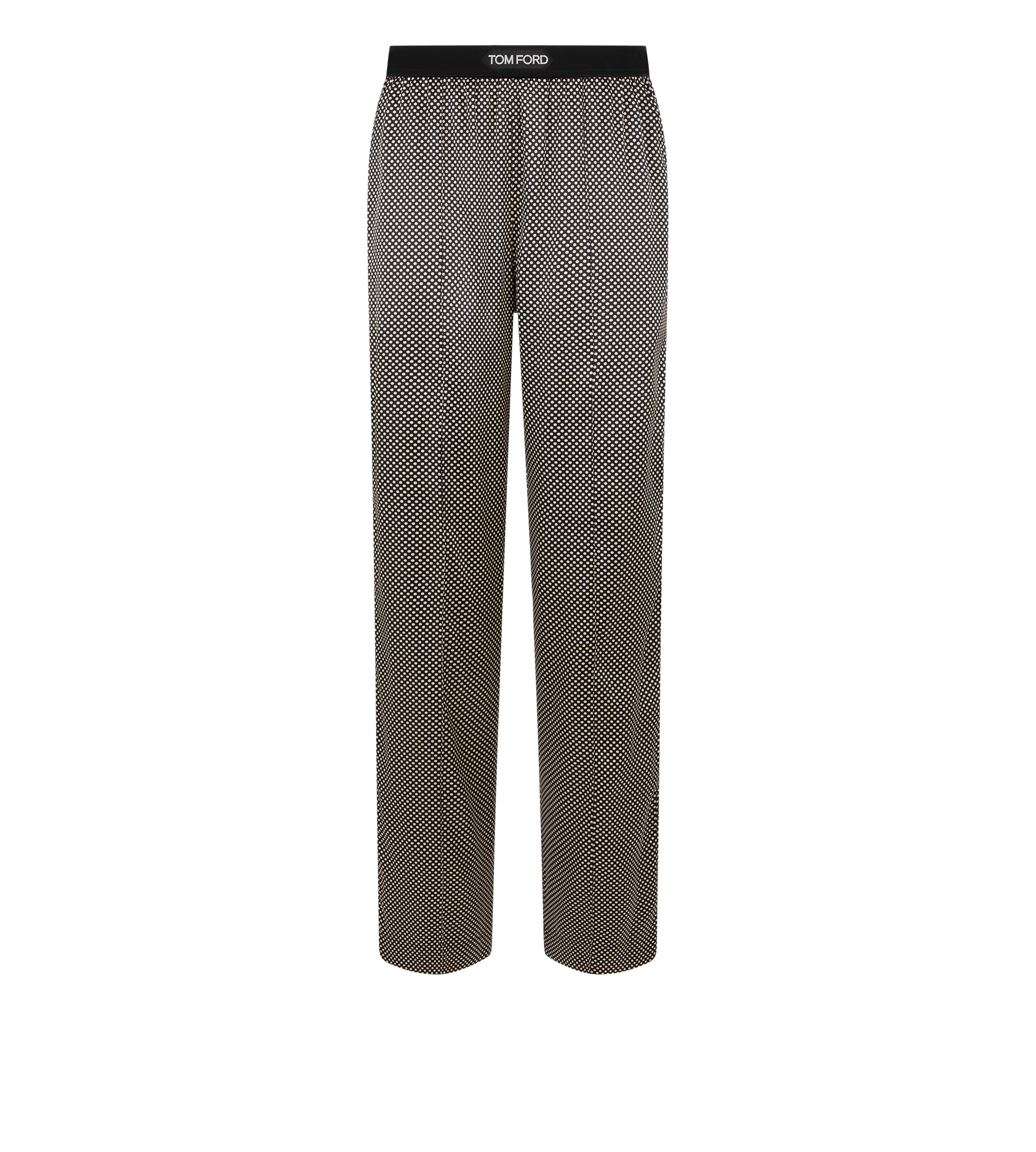 - RELAXED FIT PJ PANTS - VELVET ELASTICATED WAISTBAND - CENTRE FRONT SIGNATURE TOM FORD JACQUARD LOGO LABEL ON WAISTBAND - SIDE SLANTED POCKETS - FRONT STITCHED PLEAT - BACK PATCH POCKETS - CRAFTED IN PRINTED POLKA DOT STRETCH SATIN - 92% SILK 8% ELASTANE