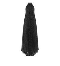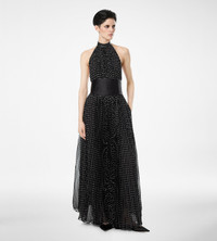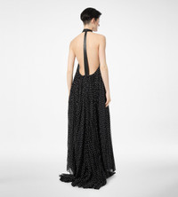 PRODUCT NO: AB3641-FAP249 A silk georgette halterneck gown with leather collar, custom sunray plisse, and high-low hemline. A dramatic, fully lined TOM FORD statement. Composition: 100% Silk Lining: 100% Silk Leather Details: 100% Lamb Leather Alterations are complimentary in store, whether you purchase online or in person. Contact our Customer Care to reserve your fitting appointment. Made in Italy