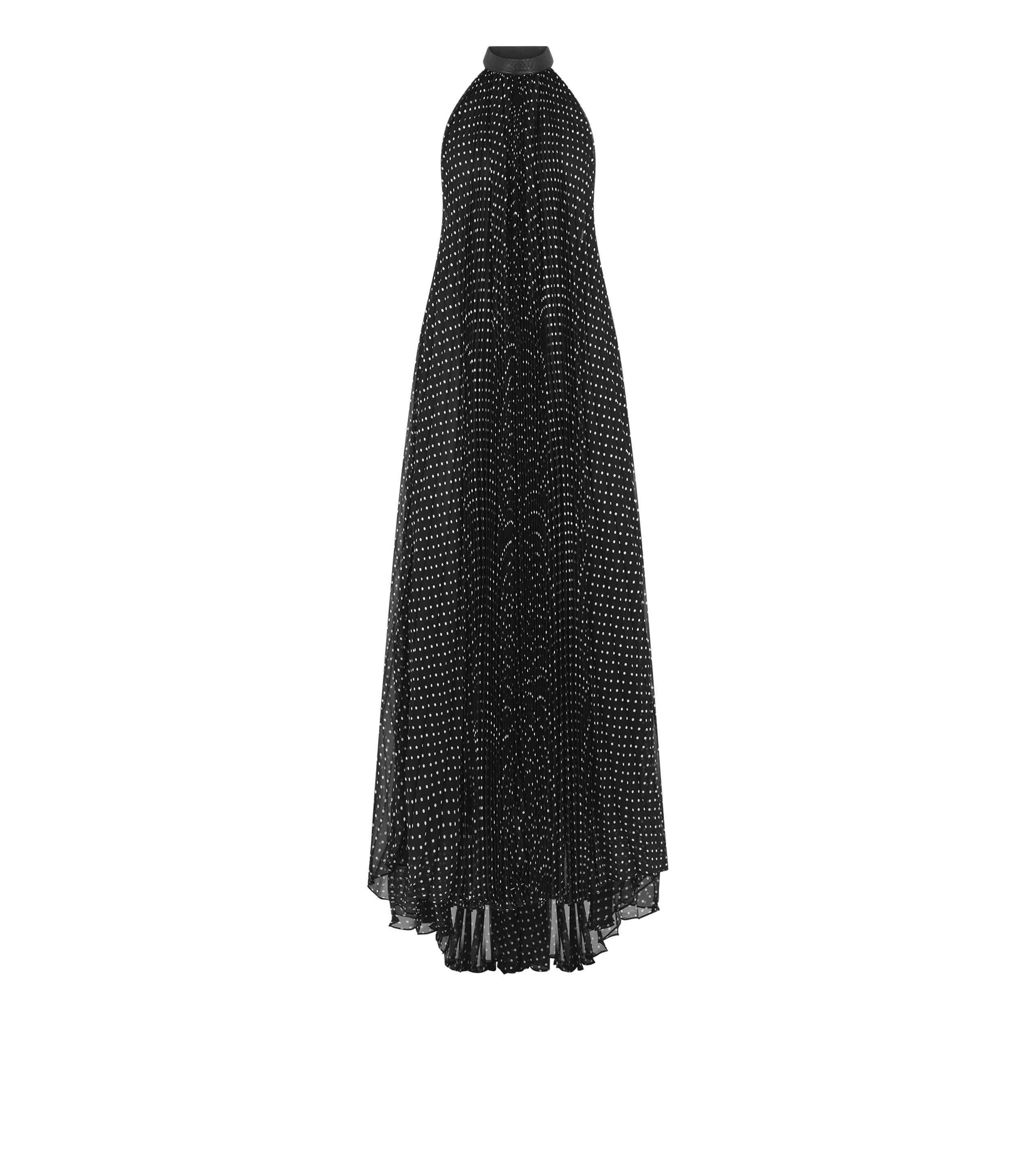 SILK HALTERNECK SUNRAY PLISSE EVENING DRESS WITH LEATHER DETAIL