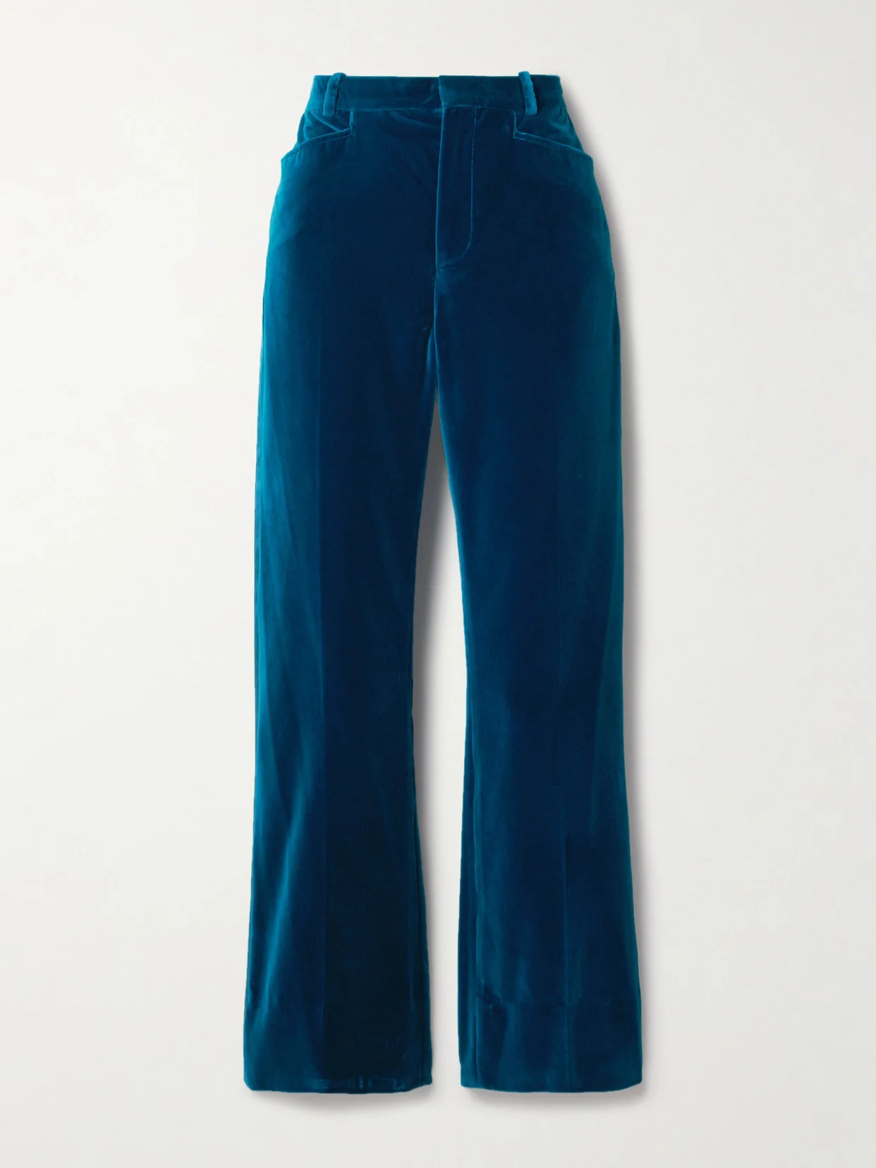 TOM FORD's cobalt-blue pants are a bold, colorful approach to classic tailoring. Inspired by tuxedo styles, they're cut from plush cotton-velvet and trimmed with silk-satin. Balance the mid-rise waist with a tucked-in top.