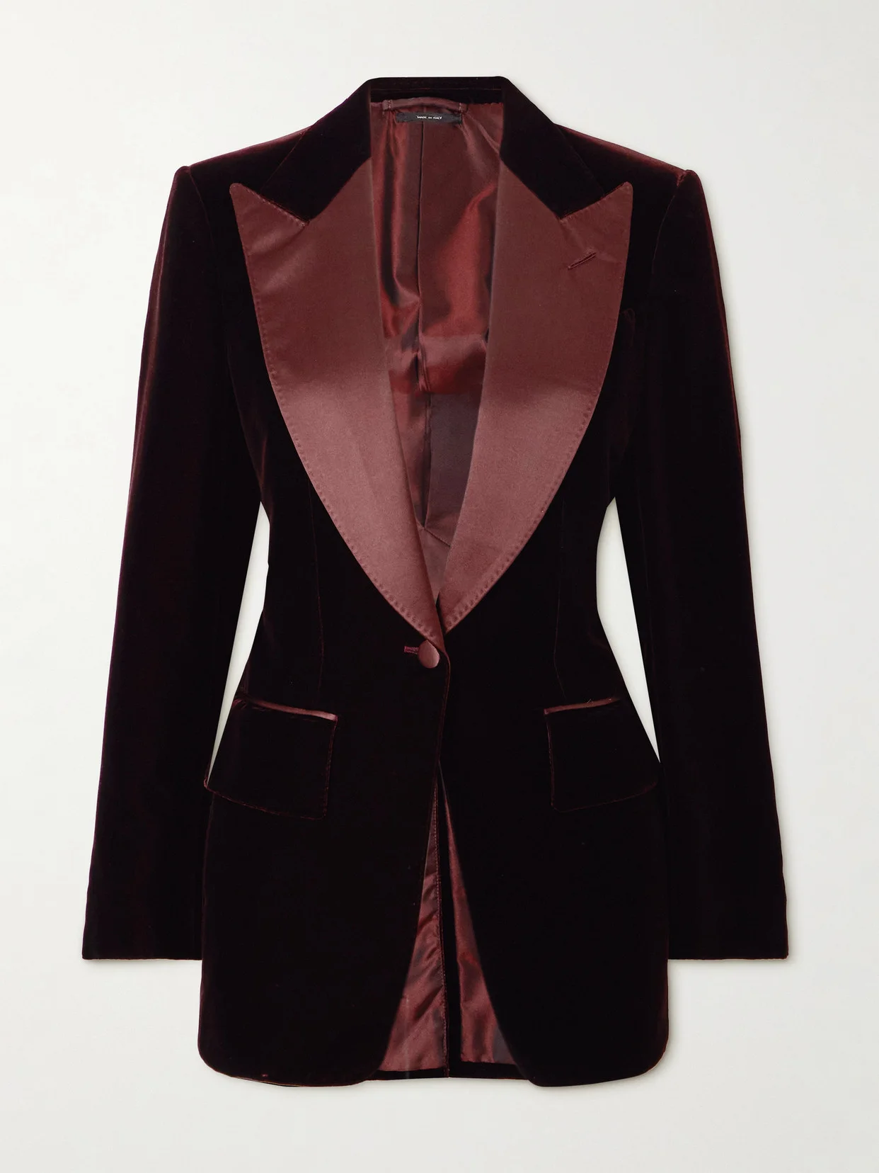 EXCLUSIVE AT NET-A-PORTER. TOM FORD's impeccable eye for eveningwear ensure you'll always look smart and chic in the brand's designs. This tuxedo-style blazer is made from plush burgundy velvet contrasted by lustrous brick silk-satin peak lapels. It's designed for a slim fit and has padded shoulders for structure.