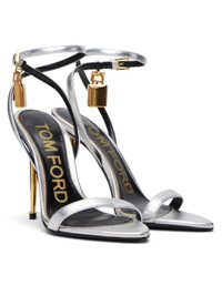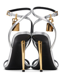 Laminated grained nappa sheepskin heeled sandals. · Open pointed toe · Padlock and logo charm at pin-buckle ankle strap · Logo printed at leather footbed · Metal stiletto heel with rubber injection · Polished leather sole · Logo-engraved gold-tone hardware · Heel: H4.25" Supplier color: Silver Upper: sheepskin. Sole: leather, rubber, metal. Made in Italy 252076F125000