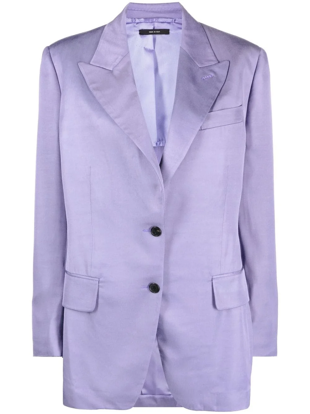 single-breasted blazer This TOM FORD blazer evokes the brand's sophistication in its simplicity. Appearing in a violet-purple hue, the single-breasted silhouette boasts a central rear vent and buttoned cuffs. Highlights - Violet purple - Satin finish - Peak lapels - Shoulder pads - Long sleeves - Buttoned cuffs - Front button fastening - Chest welt pocket - Two side flap pockets - Central rear vent - Straight hem Made in Italy Composition Outer: Viscose 100% Lining: Viscose 54%, Polyester 46% SIZE & FIT Model measurements Height 5 ft 11 in(1.8 m) Bust/Chest 32.67 in(83 cm) Hips 36.22 in(92 cm) Waist 24.4 in(62 cm) FittingInformation Designed to be unstructured, offering a loose fit throughout The vented hem offers movement at the rear Made from a midweight non-stretch fabric This piece fits true to size – take your usual size Washing instructions Dry Clean Only