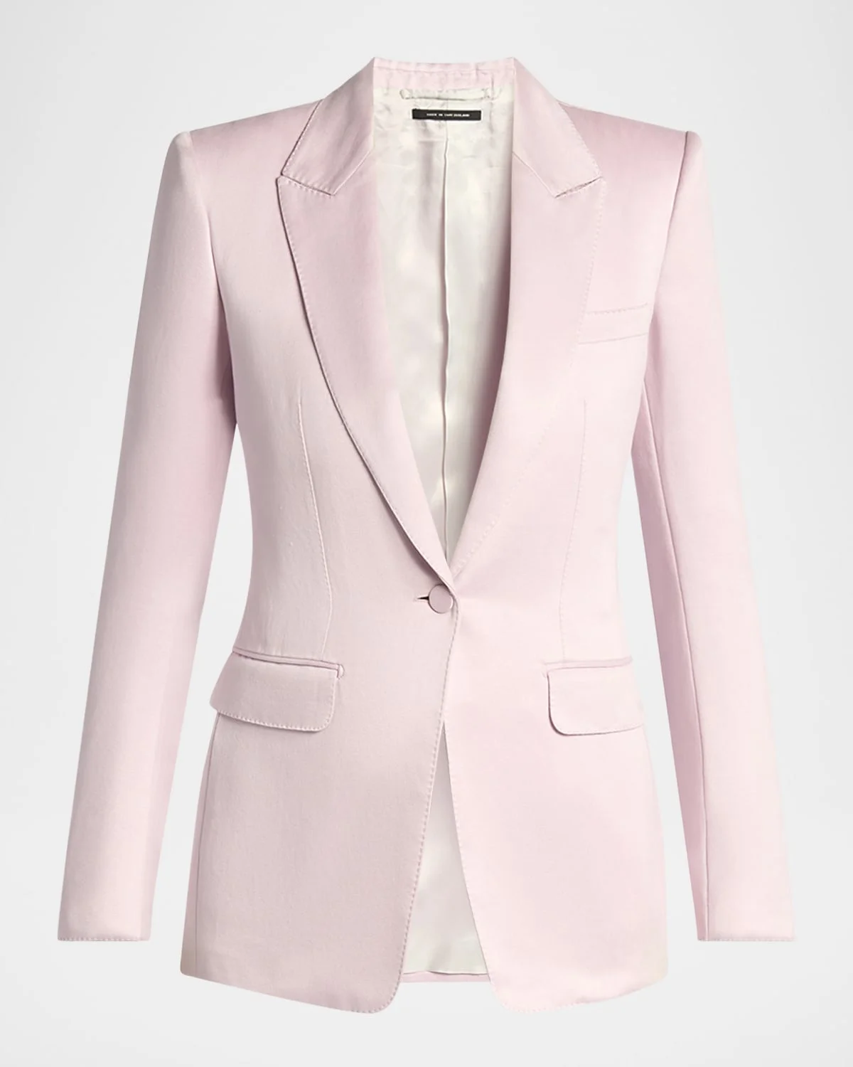 TOM FORD blazer jacket is tailored in a silk blend featuring topstitching details and selfcovered buttons Peak lapels; singlebreasted front Long sleeves; button front Chest welt pocket Hip flap pockets Slim fit Hem falls below the hip Walking vent back Button closure Silk/nylon/polyamide Made in Italy
