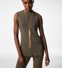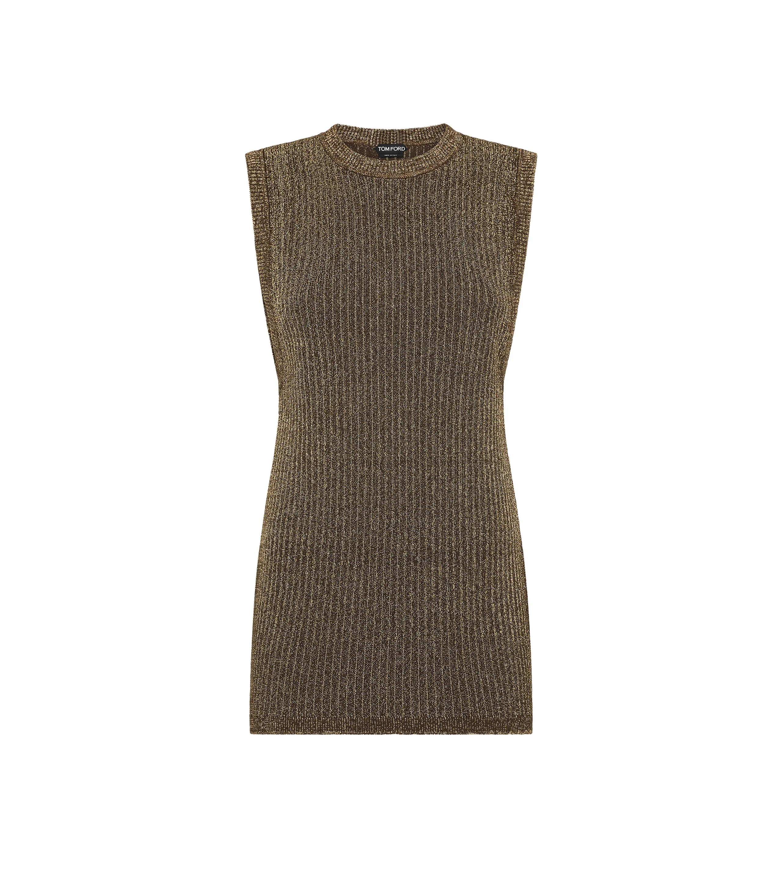 - KNITTED SLEEVELESS CREWNECK TOP - SIDE SLITS - TOM FORD LOGO METAL PLAQUE - RIB FINISHING - CRAFTED IN VANISE' VISCOSE LUREX RIB - 14 GAUGE - 67% VISCOSE 15% METALLIC POLYESTER 16% POLYAMIDE 2% POLYURETHANE - MADE IN ITALY