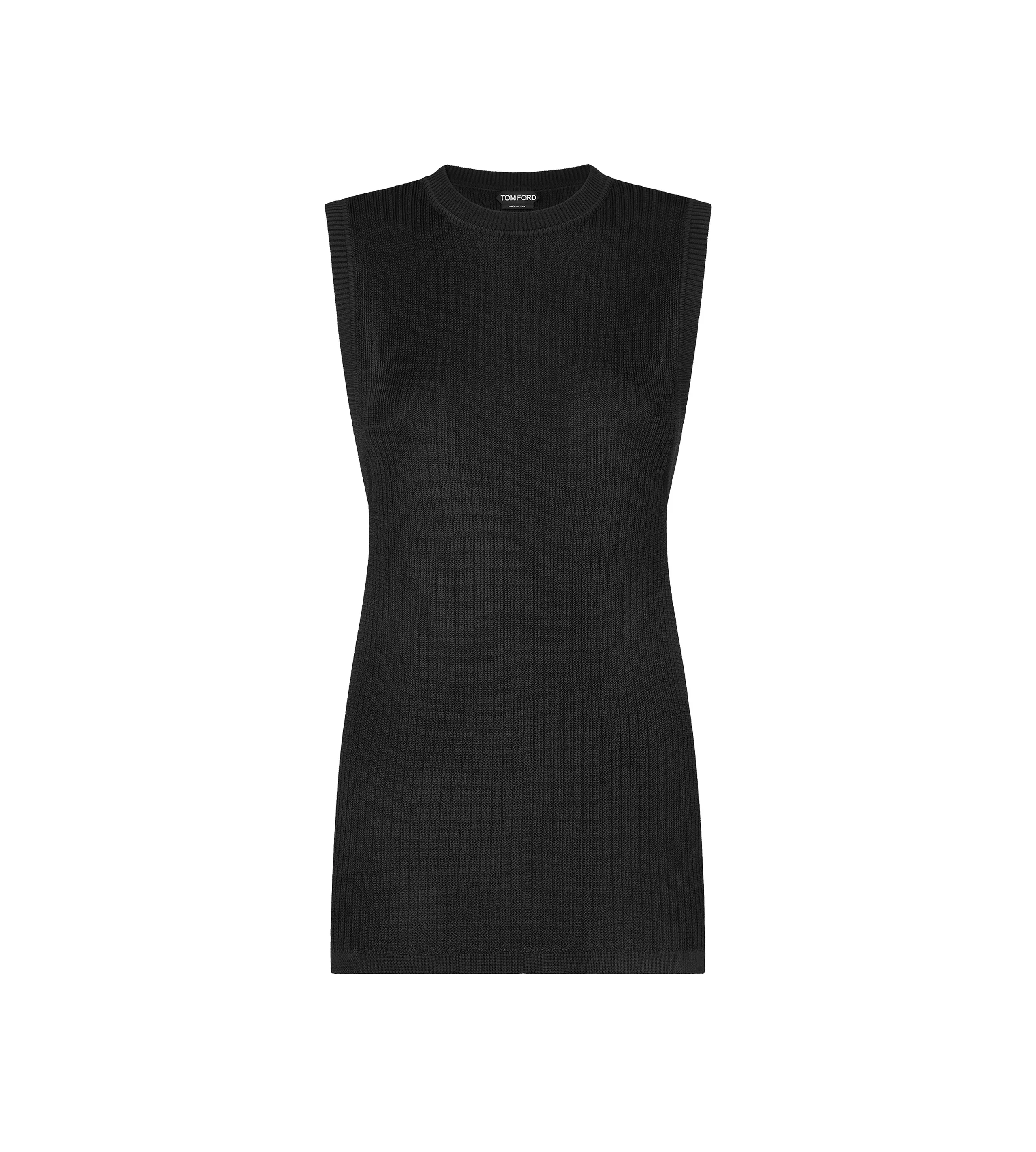 - KNITTED SLEEVELESS CREWNECK TOP - SIDE SLITS - TOM FORD LOGO METAL PLAQUE - RIB FINISHING - CRAFTED IN OPAQUE VISCOSE RIB - 14 GAUGE - 80% VISCOSE 10% SILK 7% POLYAMIDE 3% POLYURETHANE - MADE IN ITALY
