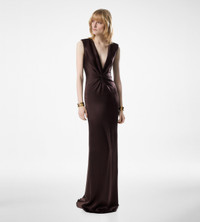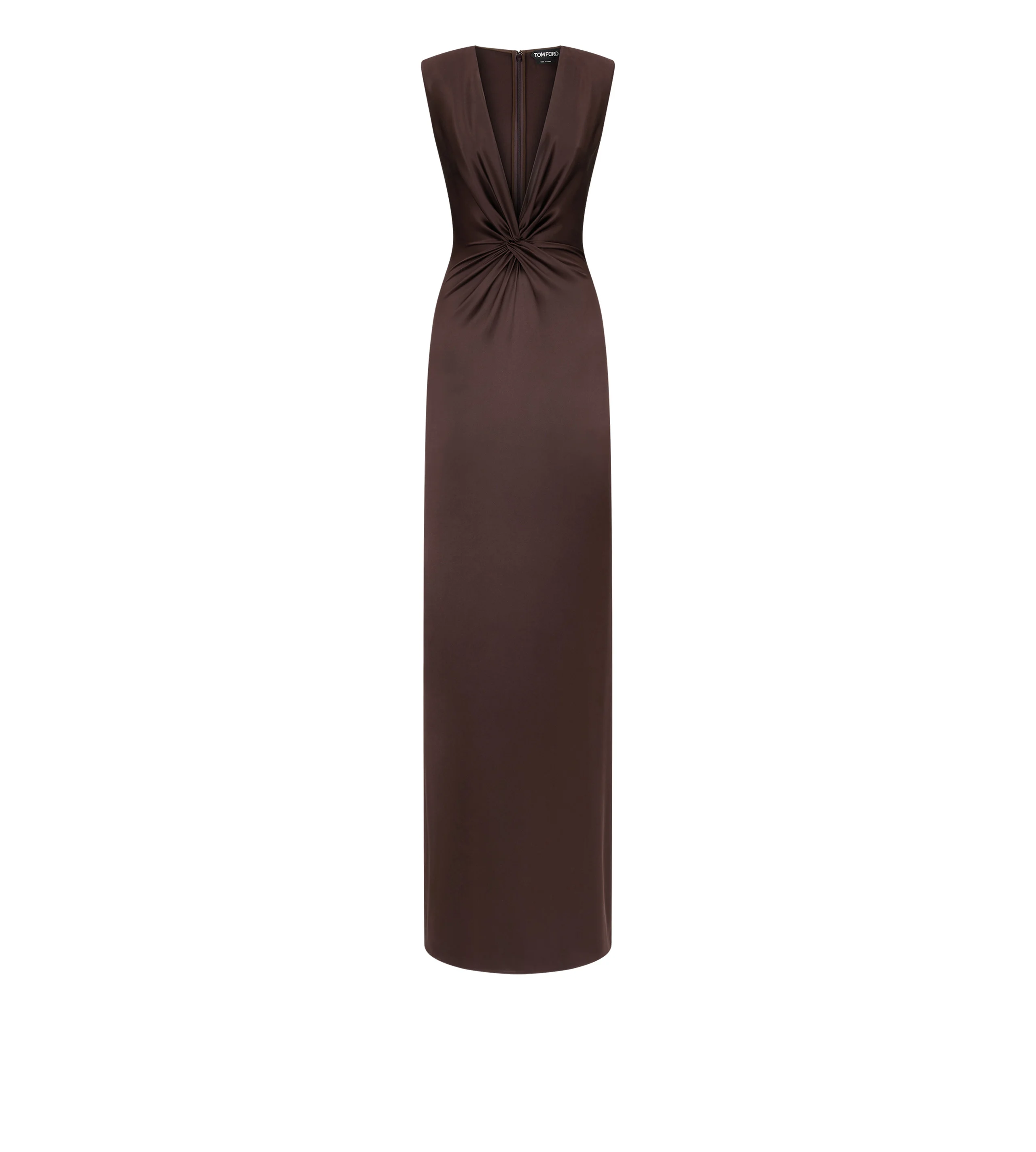 - SLEEVELESS EVENING DRESS - DEEP V-NECK WITH TWISTED FRONT DETAIL - KNOT IS CREATED BY THE INTERWEAVING OF TWO FABRIC PANELS, CREATING A SLIGHT GATHERING AT THE CENTRE - STRUCTURED SHOULDER PADS - INVISIBLE ZIP AT THE CENTRE BACK - FLOOR LENGTH - CRAFTED IN FLUID SILK SATIN - 100% SILK