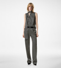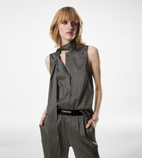 PRODUCT NO: TS2111-FAP236 Fluid and feminine, this TOM FORD sleeveless blouse in printed stretch satin features a double scarf that cascades from the collar, refined by hidden buttons in Mother of Pearl. Composition: 92% silk, 8% elastane. Made in Italy.